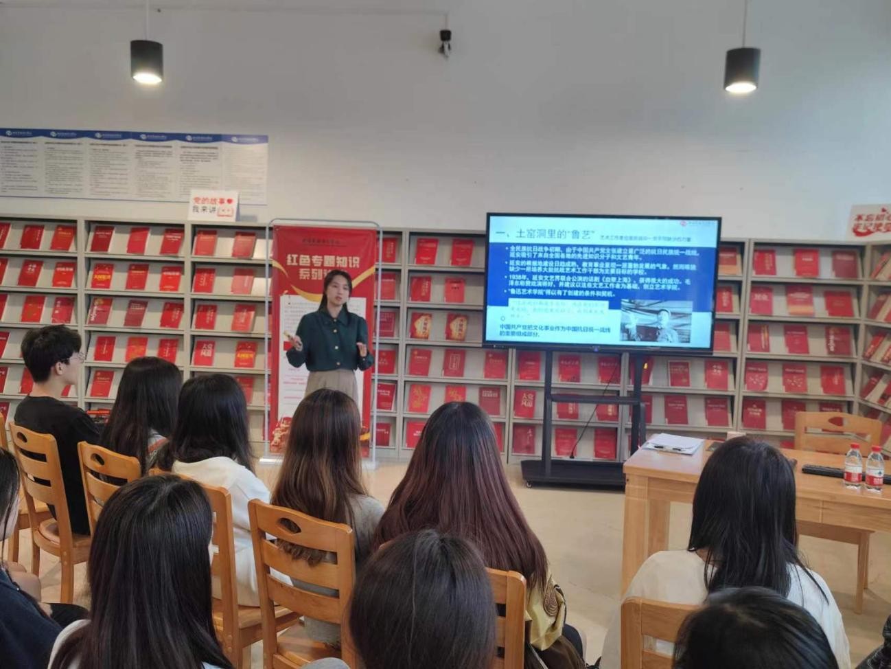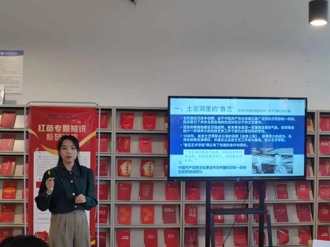 11月24日下午5:00,红色专题知识系列讲座在图书馆三楼如约开讲,本次讲座的主题是从延安走来的鲁艺,由马克思主义学院王佳碧老师主讲。