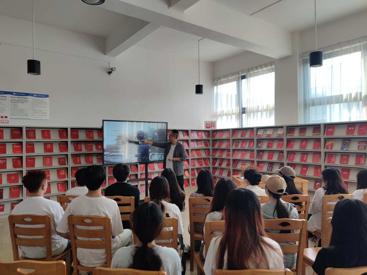 5月10日下午5:00,张宇飞老师在图书馆三楼“红色阅读角”举办红色知识专题讲座,本期讲座的主题是从百年沧桑到大国崛起。(张新玲摄)