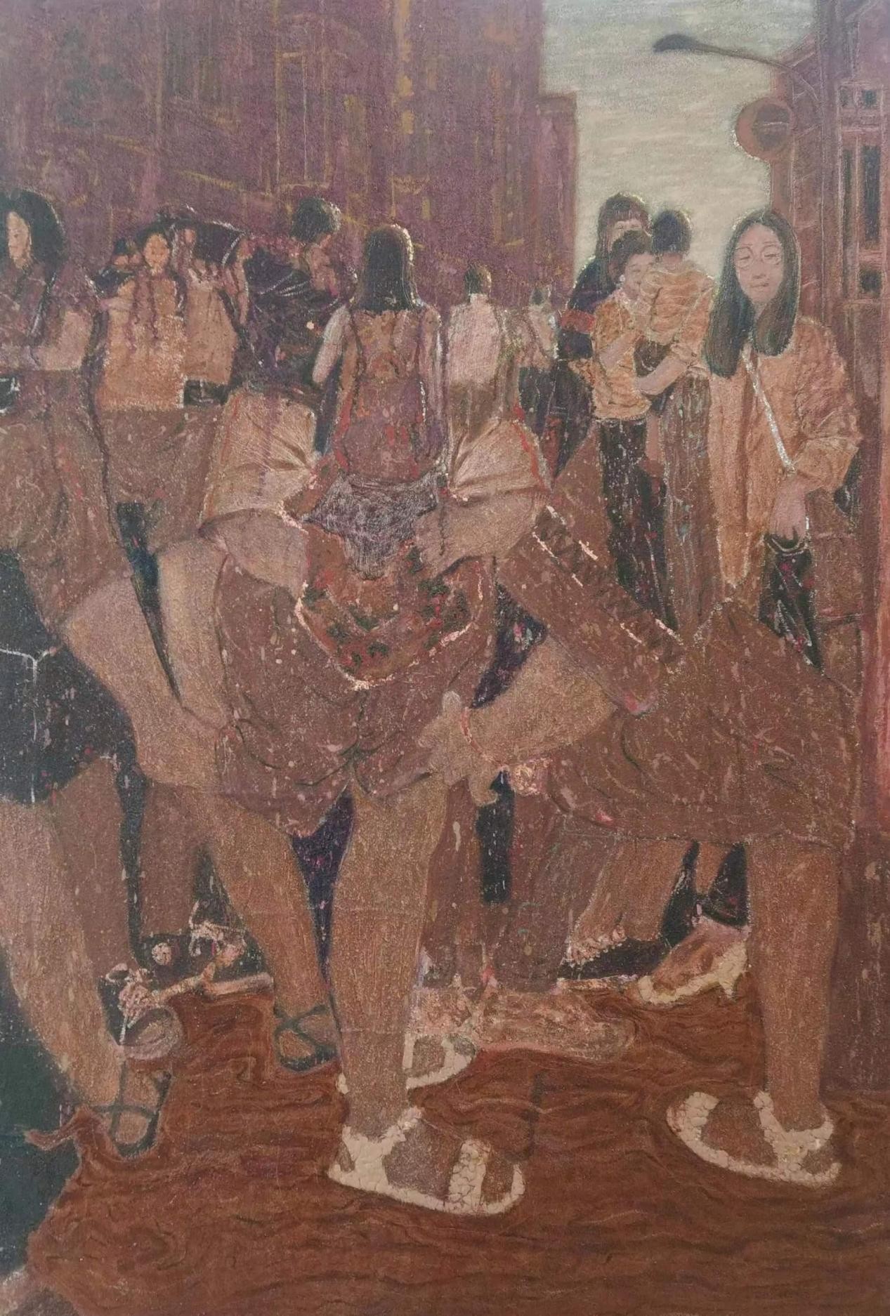5.对新型绘画语言的探索,对材料表现力的尝试和挖掘。我们看到,今年学生的作品,不仅题材广泛,形式新颖,所运用的材料也是丰富多样,各具风采,他们并不局限于传统国画、油画所惯常使用的材料,而是在岩彩的运用、肌理质感等许多方面,做了大量的尝试性实验,用以提升他们作品的表现力和感染力。