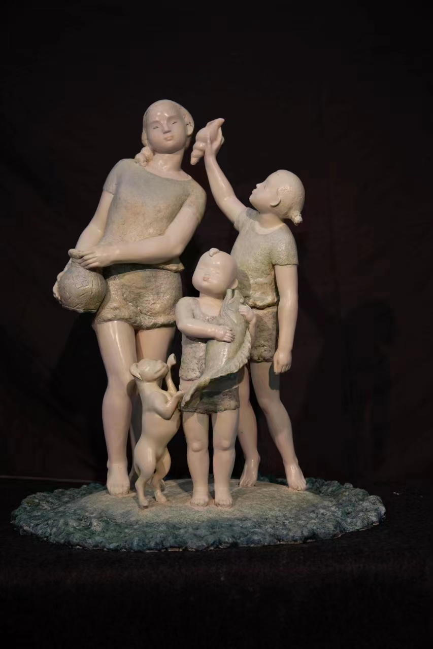 作品灵感来源于北部湾家庭渔获归来的温馨场景。采用具象写意手法,在圆形浪花底座上,以旋转三角构图呈现北部湾乡村渔民家庭赶海暮归。一家三口与小狗满载而归,洋溢喜悦,既展现渔民与海相依的日常,更传递对大海的敬畏热爱。