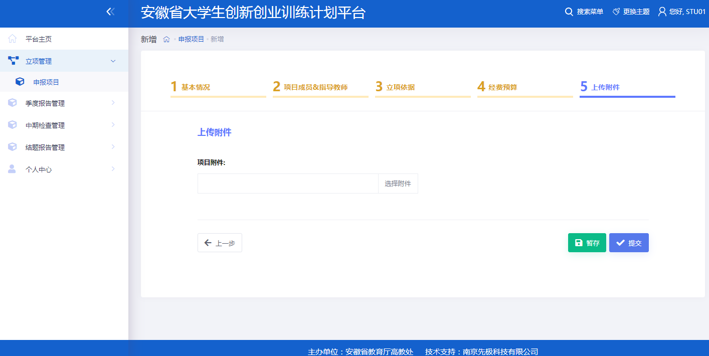第五步附件上传。点击选择文件后,会跳出选择文件的界面,文件选择进来后再点击上传按钮即可上传附件。