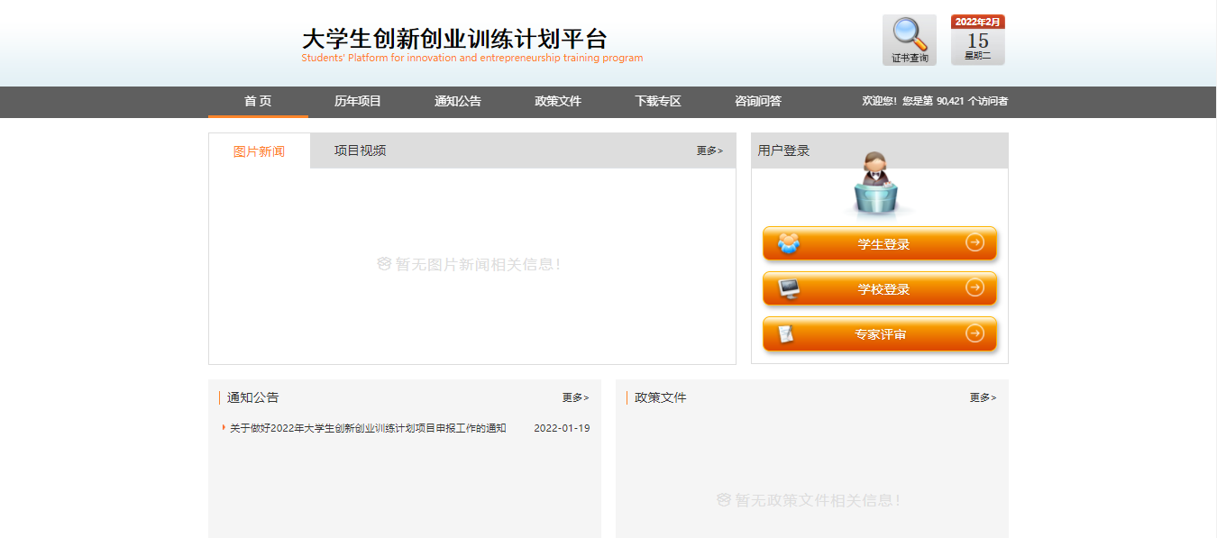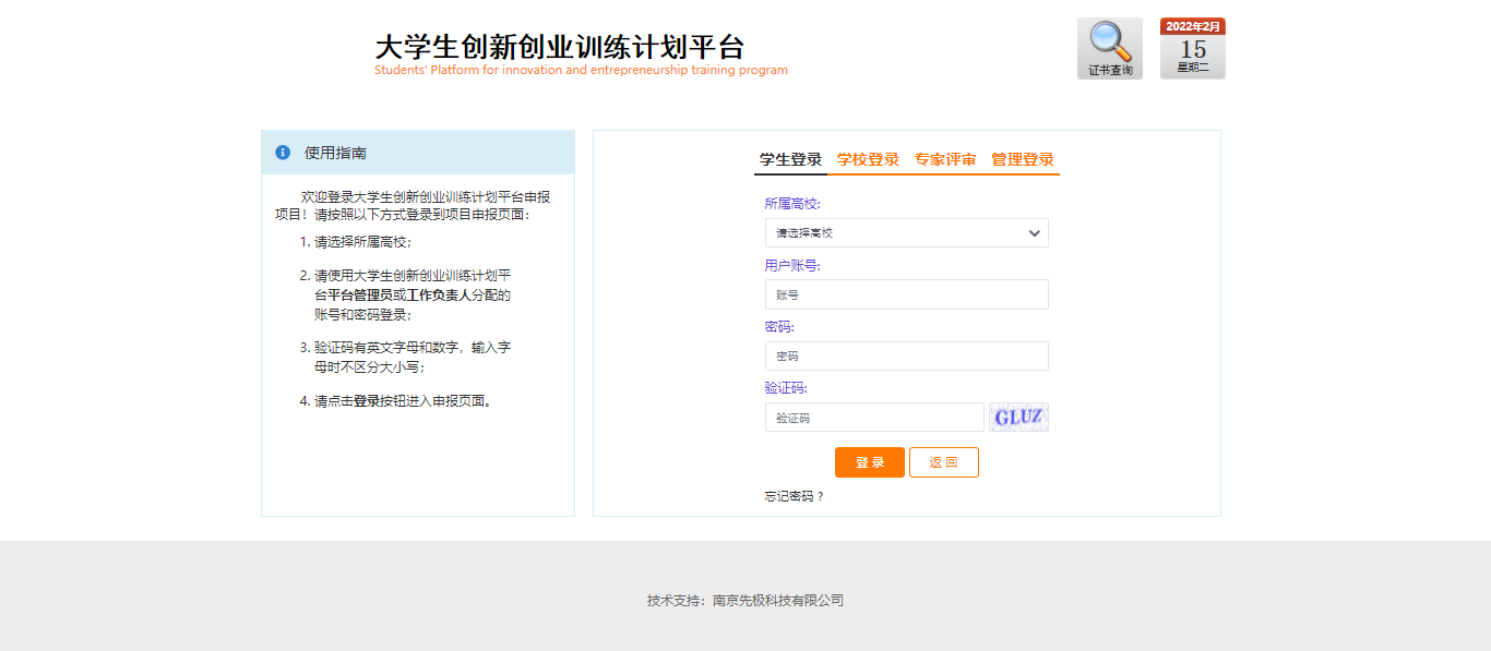 平台地址:http:114.220.75.43:1008、(选择“访问新版”)初始帐号默认为学生学号,初始密码为默认为账号(学号)+@cxcy,账号(学号)详见“拟立项项目名单公示”。在浏览器输入平台地址(建议使用谷歌、火狐、360浏览器极速模式),点击页面中的“学生登录”,输入对应的账号和密码进行登录。进入角色的后台管理界面完善相应的项目信息。
