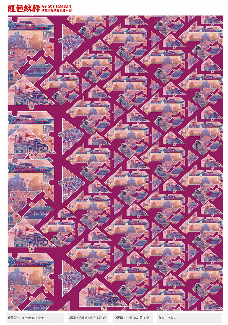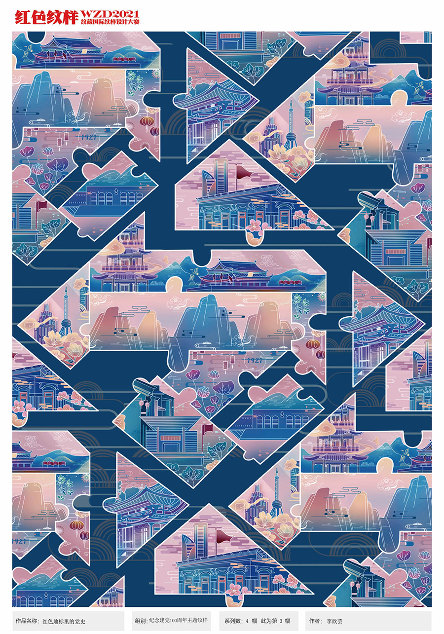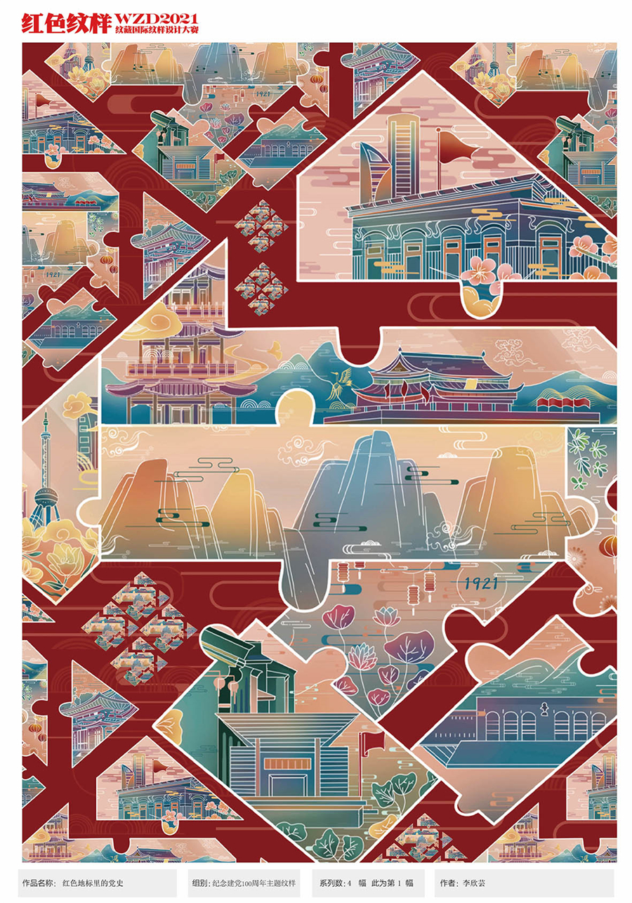 《红色地标里的党史》系列纹样设计以拼图的形式去描绘党的艰辛历程和一路走来的艰难险阻。整体运用了中国风的风格,底图采用中国传统纹样做背景,象征着中国民族的精神,虽饱经沧桑、历经风雨,但如今依然屹立在世界民族之林。纹样以江西、延安、北京、上海等众多红色革命根据地拼接而成,是中国共产党革命精神的象征,即对理想和信念执着追求的力量之源。我们坚信中国共产党将继续带领中华民族走向繁荣。