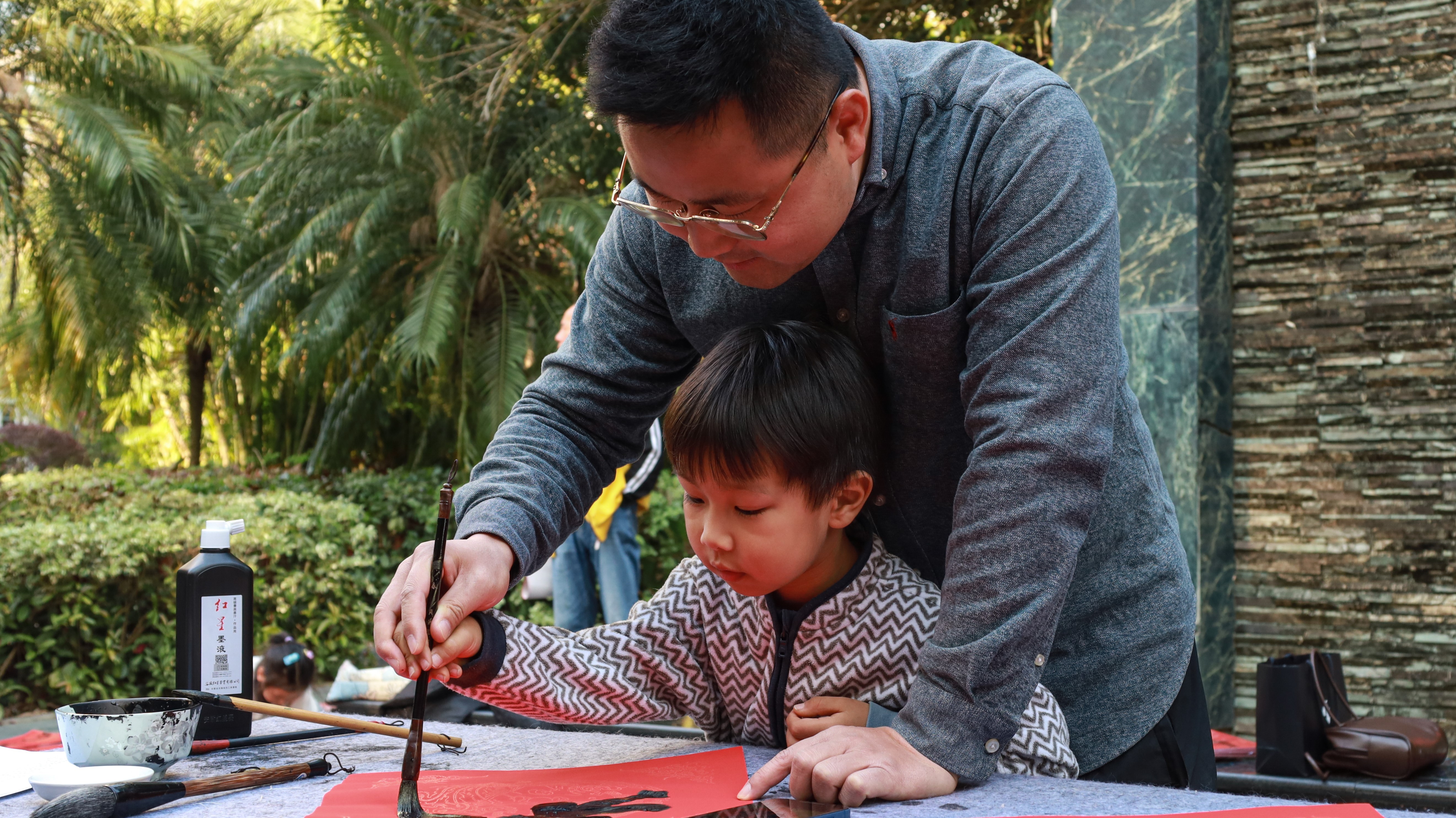 书法学院美术学院师生们不仅展现了书法艺术的魅力,更吸引了众多社区居民驻足欣赏,投入到书法艺术之中。老师们现场他们手把手指导小朋友书写对联,小朋友们稚嫩的笔触下,一个个充满童趣的汉字跃然纸上,虽然笔法稍显青涩,但字里行间却满是喜悦。