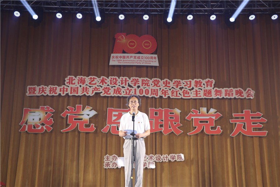 校长卢新华为本次晚会致辞,他指出:在学校党委领导下,我校推出“八展三演”,以优异的教学成果向党汇报,庆祝中国共产党百年华诞。“感党恩跟党走”党史学习教育暨庆祝中国共产党成立100周年红色主题舞蹈晚会,不仅展示了我校师生的教学成果,还将进一步激发我校师生的学史知史爱党爱国情怀,营造我校健康向上、团结奋进的氛围。全校师生以实现北海艺术设计学院第二个20年的发展目标——创办西部一流艺术设计学院和建成民办高校党建典范而努力奋斗。