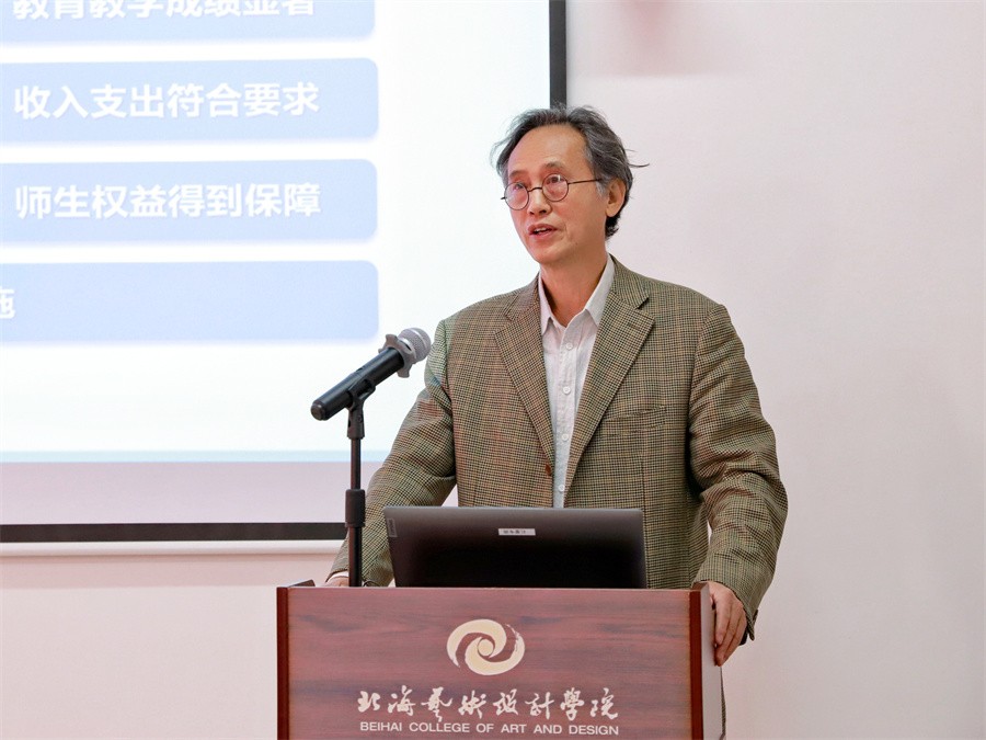 校长卢新华代表学校对年检专家组一行的到来表示欢迎和感谢,并在党建思政工作、基本办学条件、学校领导体制、教育教学规范、财务管理制度、师生权益建设等方面作了汇报。卢新华指出,学校以习近平新时代中国特色社会主义思想为指导,坚持社会主义办学方向,立德树人为根本任务,全面学习宣传贯彻落实党的二十大精神。为全国文化艺术行业和地方经济社会发展培养了大批高素质应用型人才。学校实行北海北京双城育人、坚持以名校名师引领,建校以来从清华大学聘任了三任校长;从清华大学、中央美术学院等名校选聘名师任二级学院院长、各专业带头人;创建“名师大讲堂”,先后邀请国内外名校、科研院所和行业企业名师工匠、专家300多人来校进行讲学交流、教学和办学指导。办学效果显著,2022年8月在中国高等教育学会首次对外发布的《全国普通高校大学生艺术类竞赛总榜单》中,我校以获奖数158项进入等级A,在全国1098所本科高校中排名前33,名列全国民办高校第2。2022年度学校荣获“全国高校设计赋能乡村振兴志愿者服务先进单位”“全区普通高校毕业生就业工作突出单位”“广西壮族自治区绿色学校”等称号。