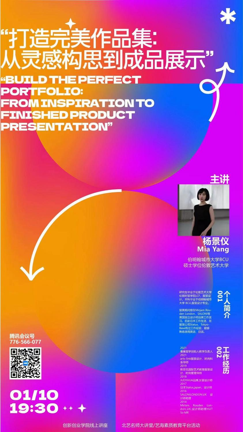 2024年1月11日,创新创业学院邀请蚕巢留学创始人杨景仪老师为我校师生开展了一场《完美作品集:艺术设计作品的创作与呈现》的线上专题讲座。