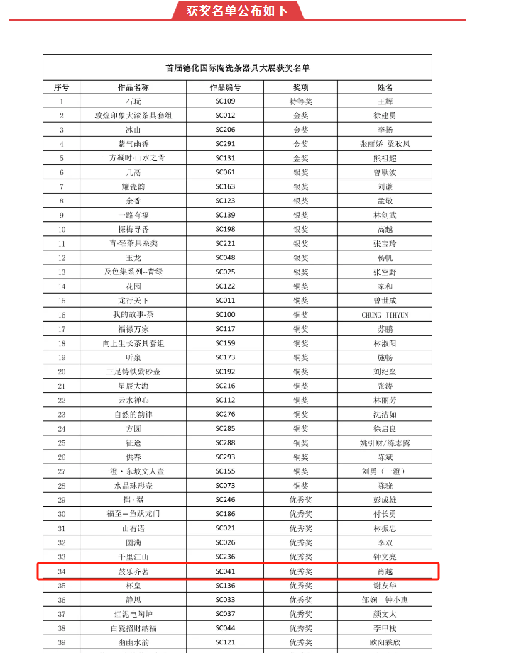 近日,第三届德化“中国白”中国传统陶瓷艺术双年展、首届德化国际陶瓷茶器具大展颁奖典礼及开幕式顺利落幕。开幕式上公布了第三届德化“中国白”中国传统陶瓷艺术双年展、首届德化国际陶瓷茶器具大展获奖名单。我校学生肖越的设计作品《鼓乐齐茗》喜获优秀奖。