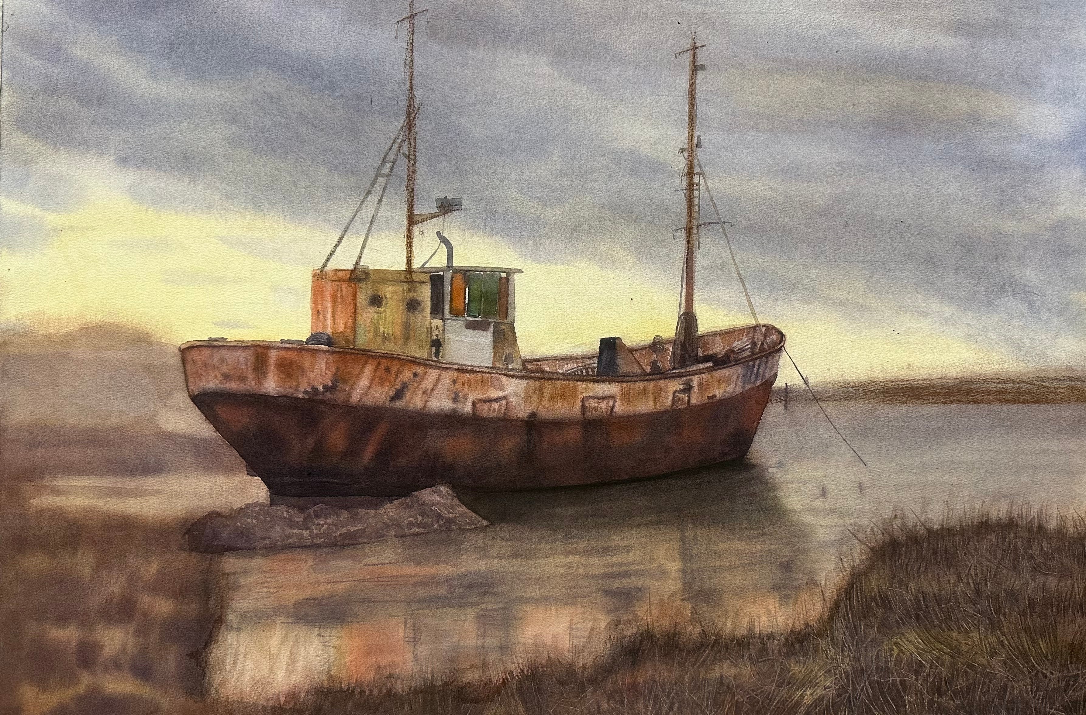 罗永在《搁浅的船》 49cm×72 cm 2023年 纸本水彩