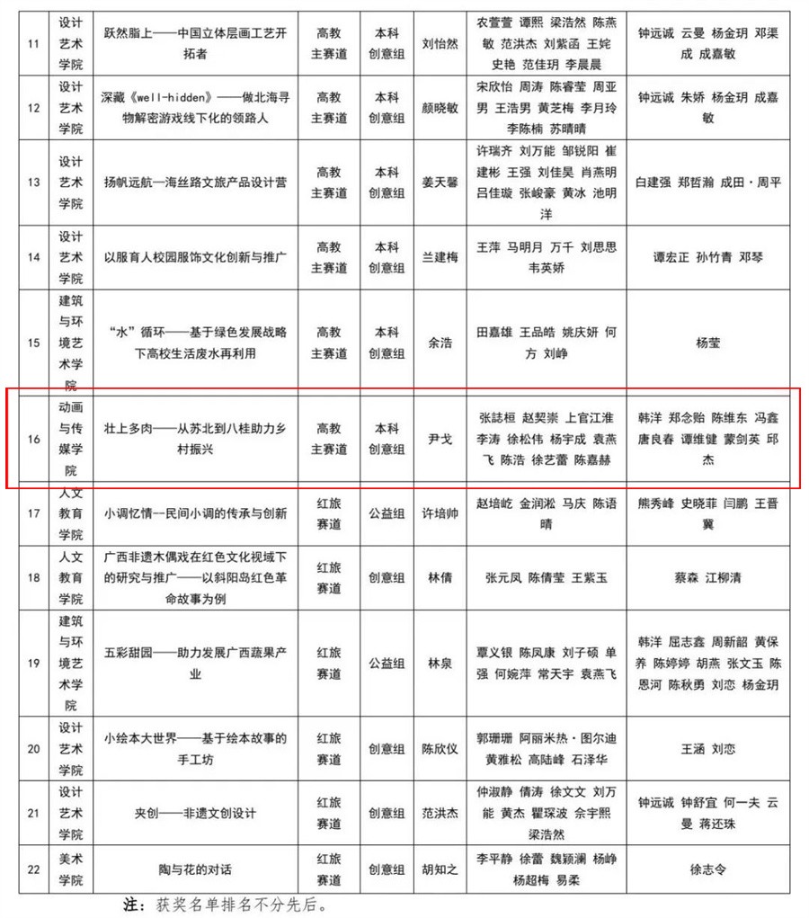 据悉,本届大赛全区共有110所学校、15.6万个项目、38.1万名学生参赛。经过校级初赛、校级决赛、区赛网评、区赛现场总决赛到评选结果公布,历时4个多月。此次大赛中,我校有22个项目脱颖而出,其中《瓷海筑梦——广西特色陶瓷产品工艺与现代性探索》获得自治区级金奖,《由你心动——互联网营销空间策略规划设计先行者》《咪咪鸭——广西锁鲜鸭货新口味的创新者》《惊喜八桂与“坭”同行》《兴瑶乡创——一带一路背景下广西瑶族文化的旅游产品开发》四个项目获得自治区级银奖,其他晋级区赛的17个项目获得自治区级铜奖。