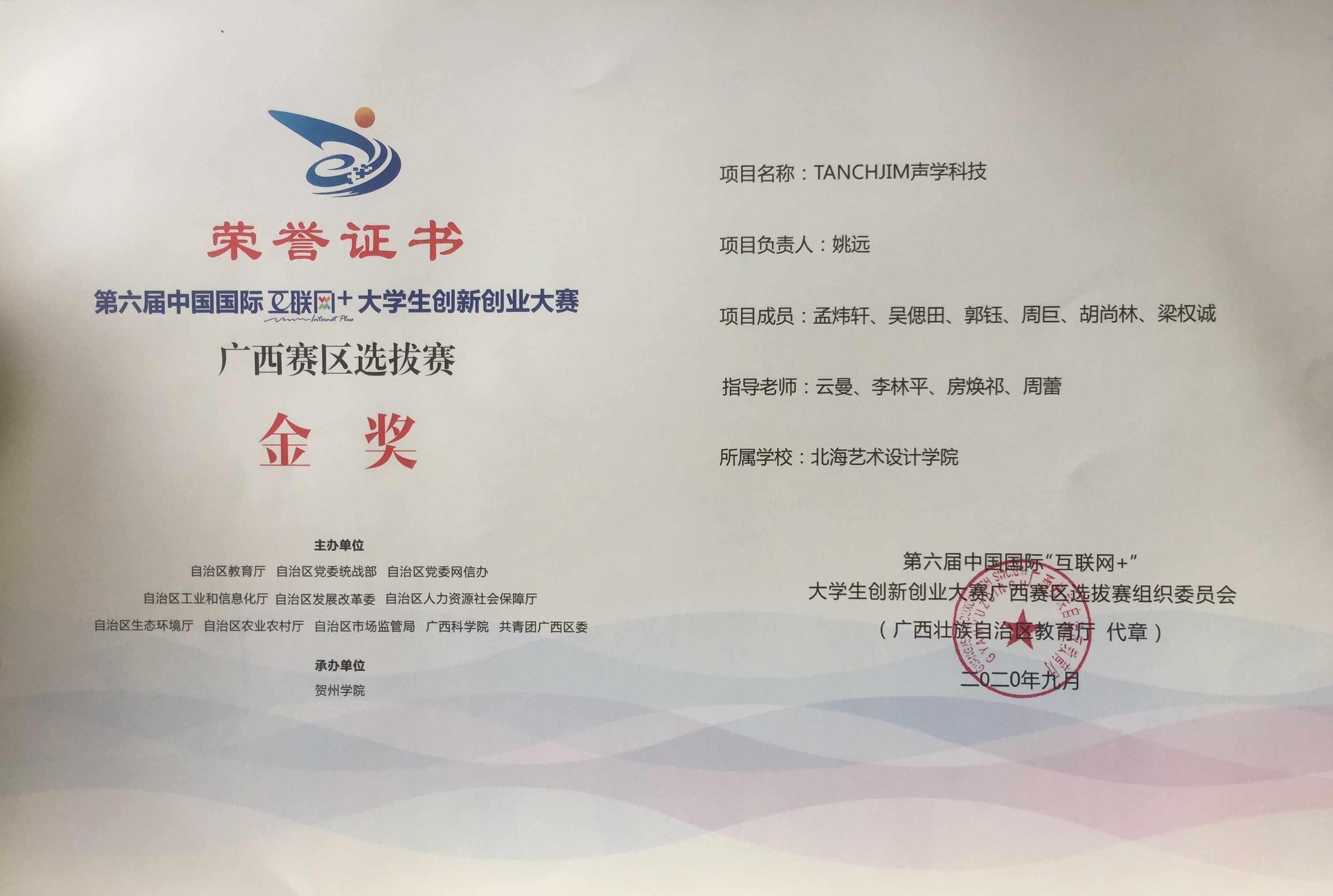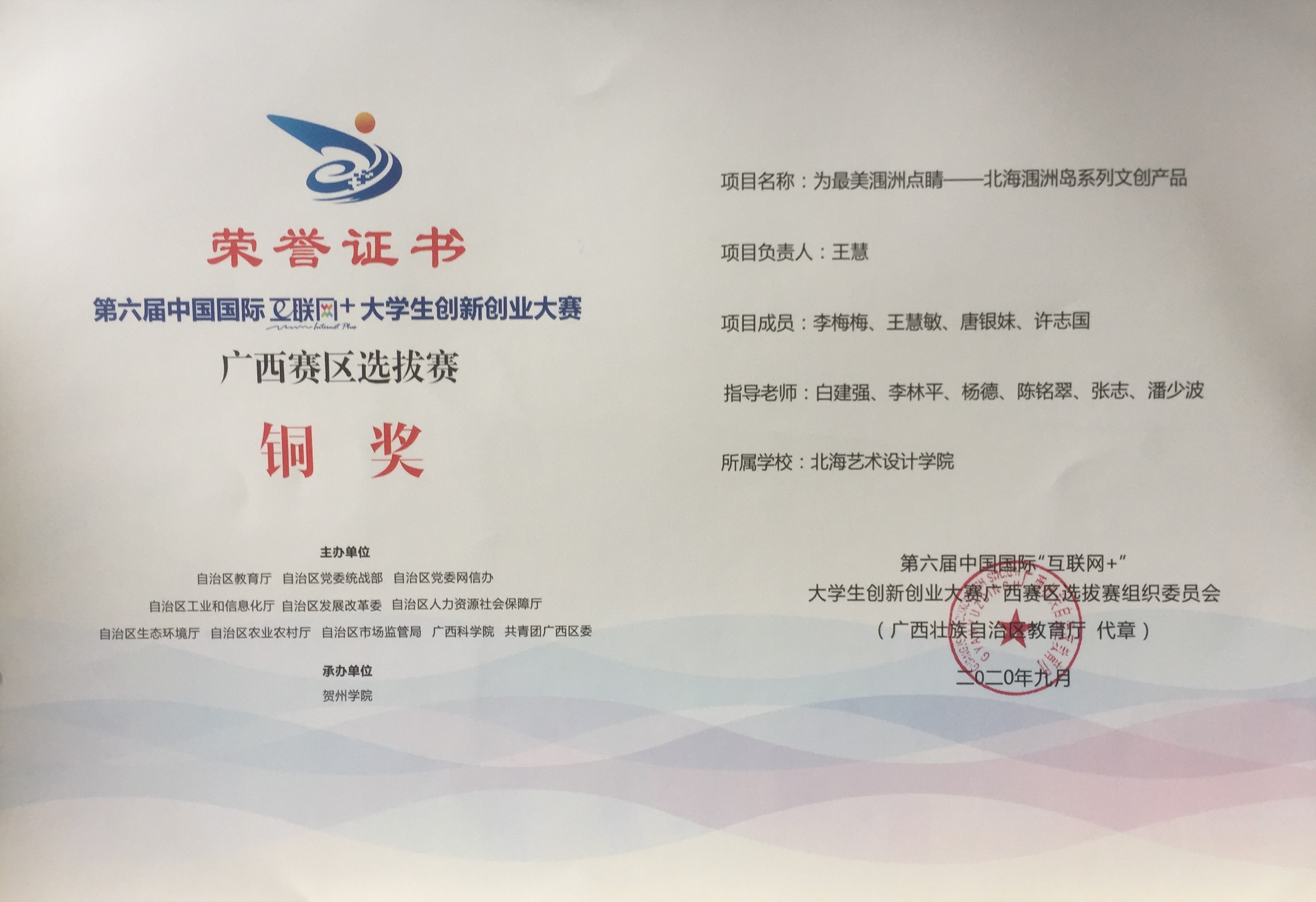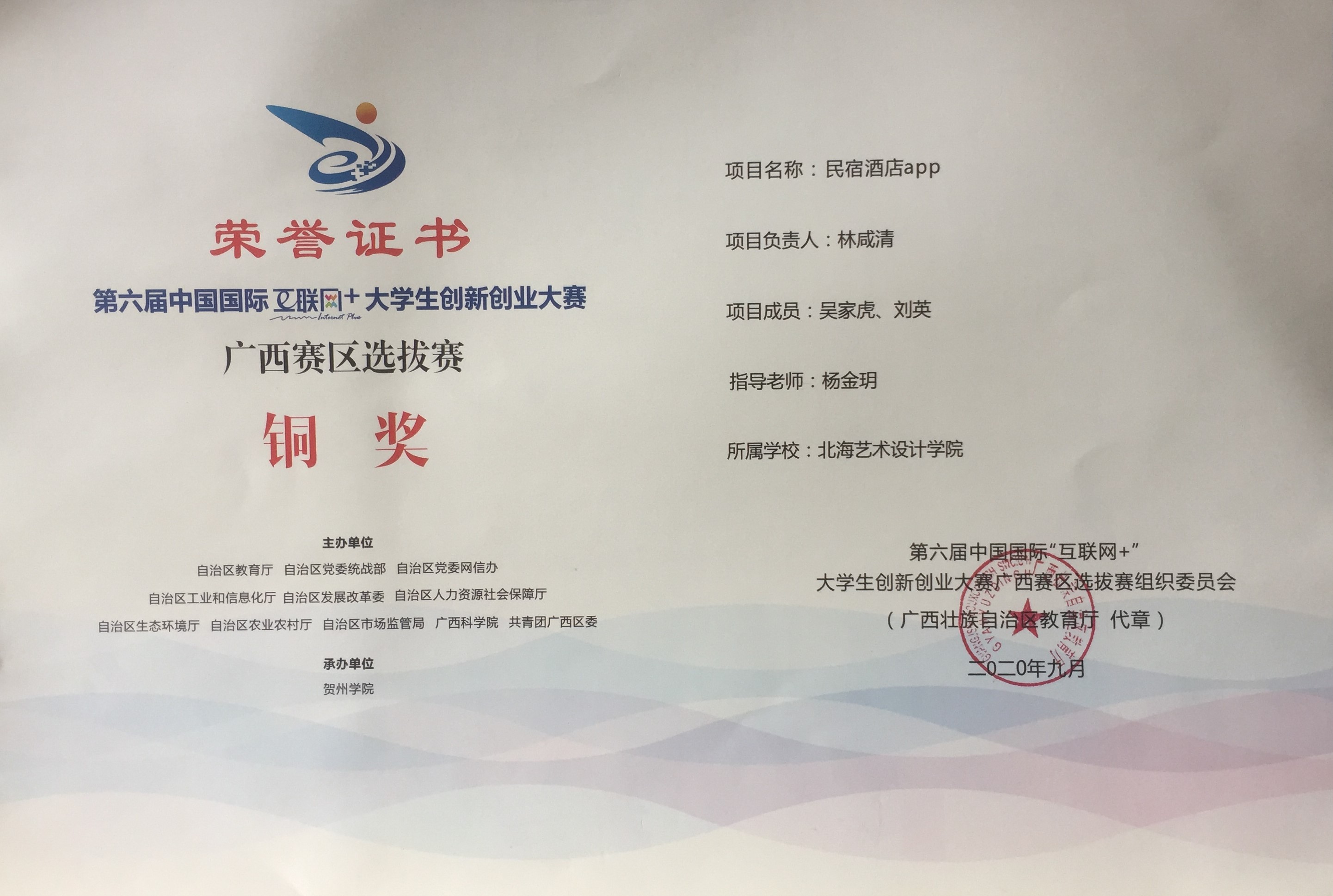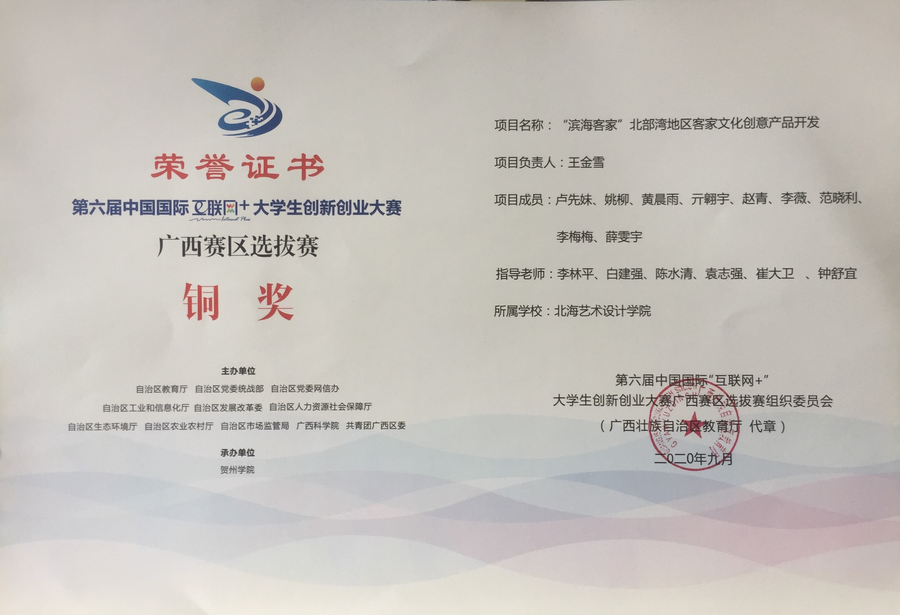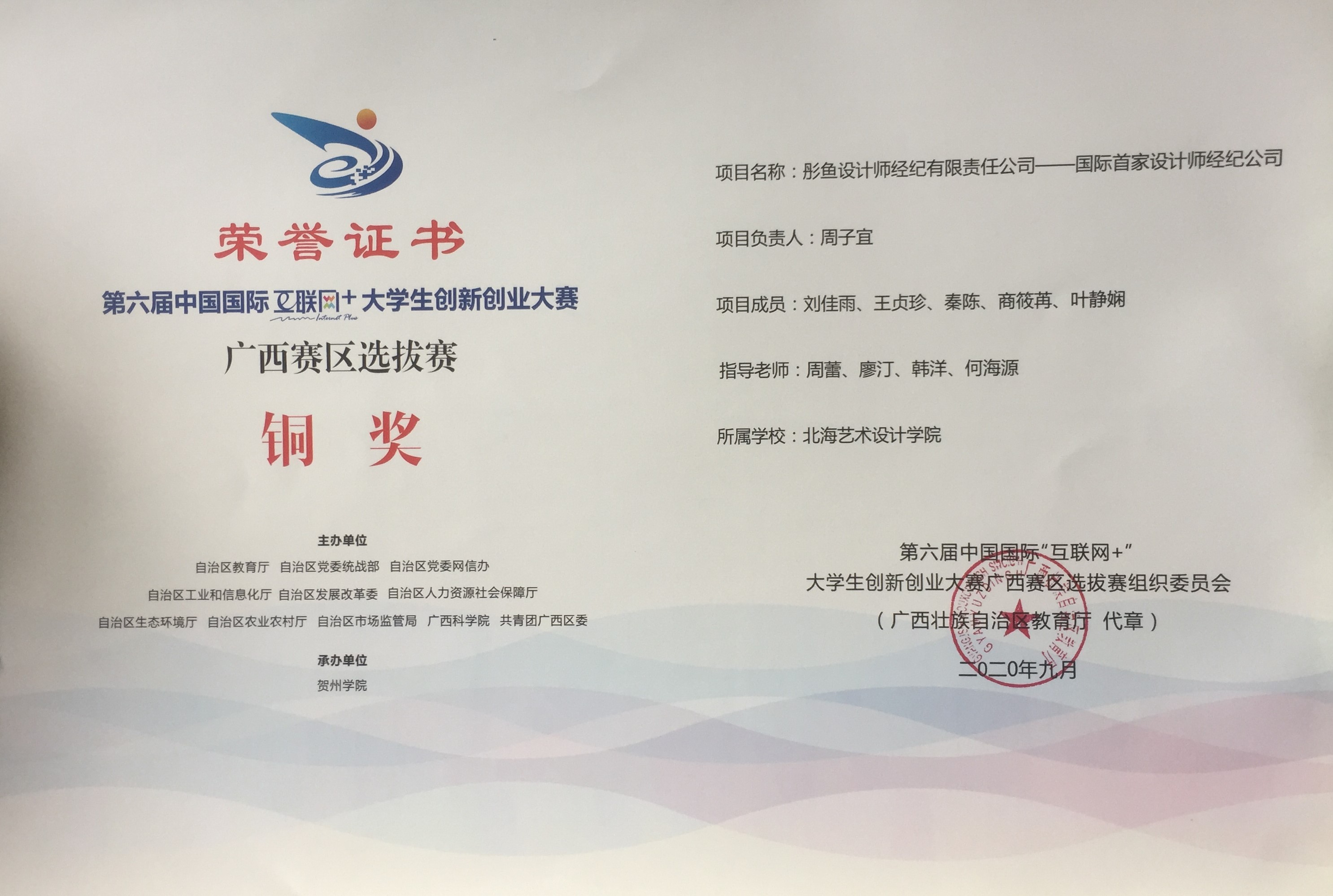 北海艺术设计学院第六届中国国际“互联网+”大学生创新创业大赛广西赛区获奖证书