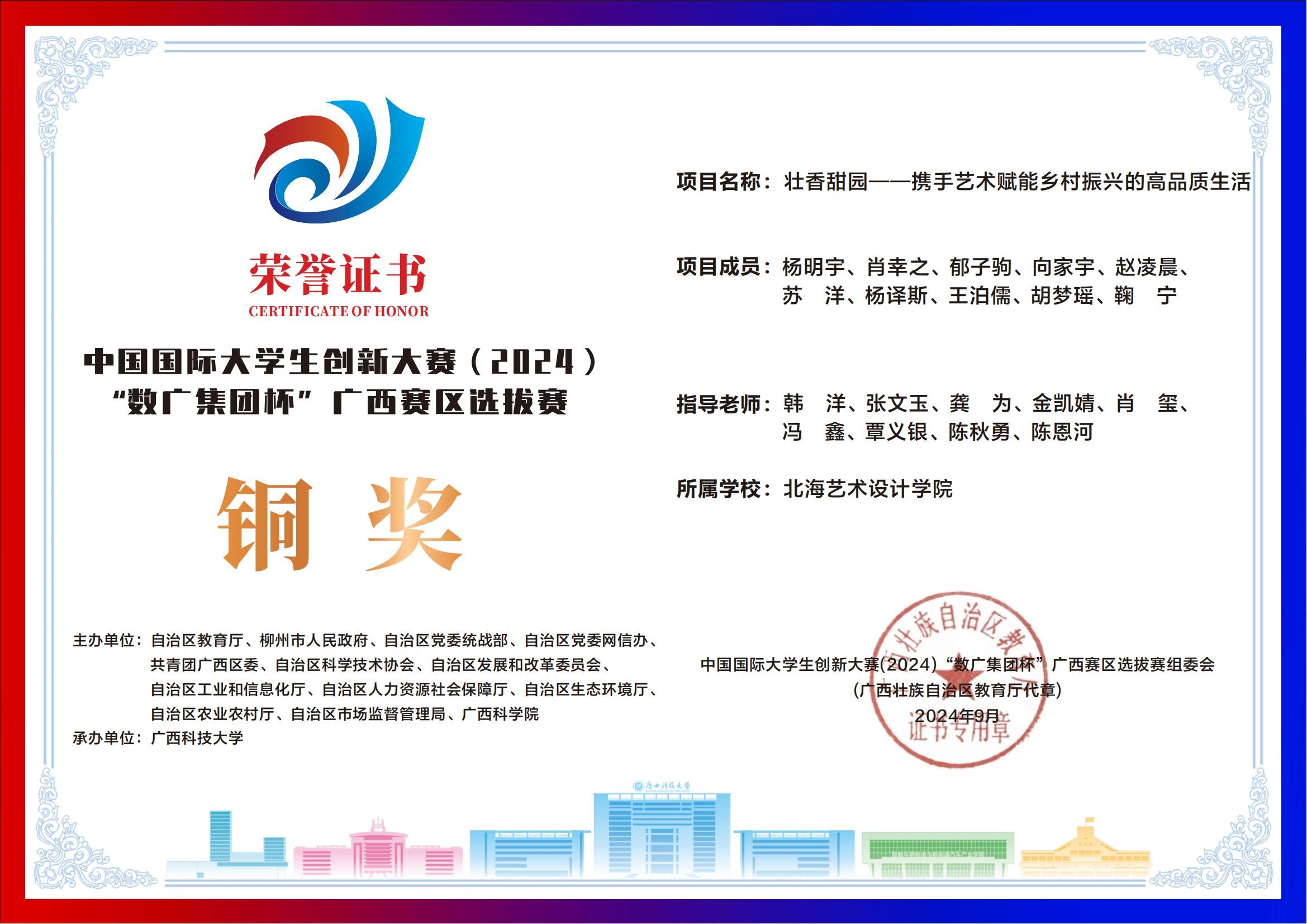 北海艺术设计学院中国国际大学生创新大赛(2024)“数广集团杯”广西赛区获奖证书