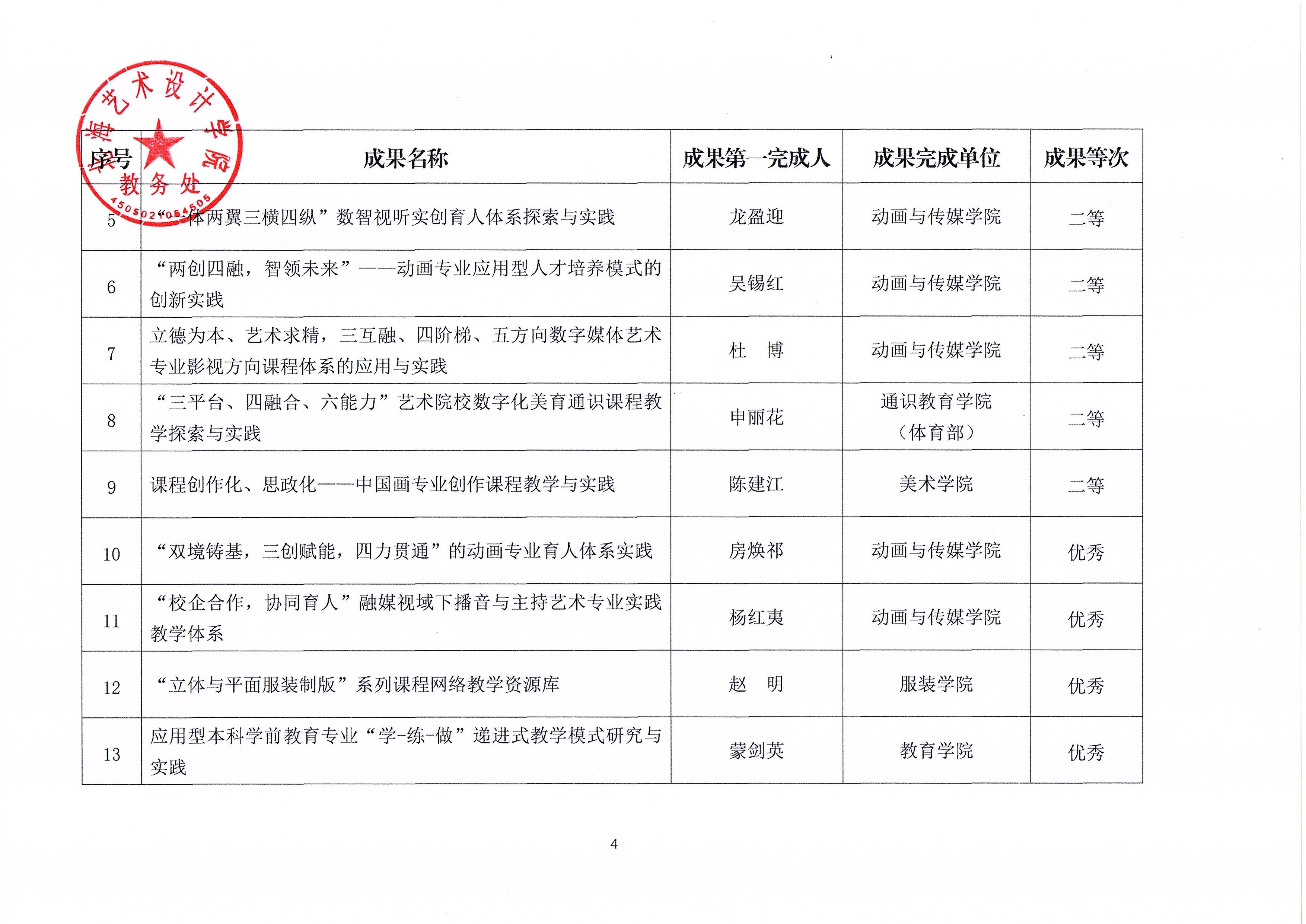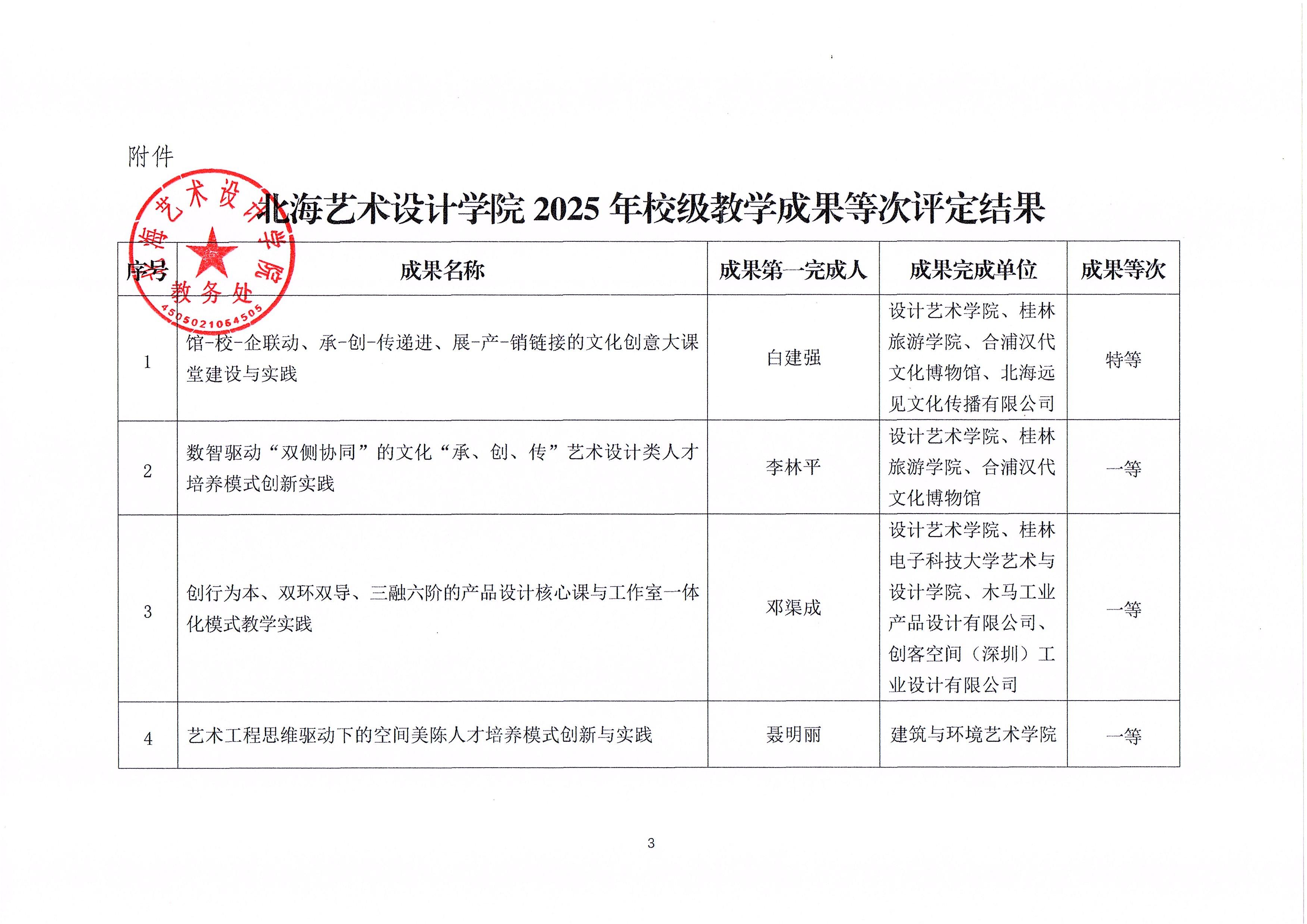 根据《北海艺术设计学院教学成果等次评选办法(修订)》 (北艺教发〔2021〕113号)要求,学校组织开展了2025年校 级教学成果等次评选工作。经各二级学院申报、学校组织专家评 审,校内公示无异议,1项成果获评特等等次,3项成果获评一 等等次,5项成果获评二等等次,4项成果获评优秀等次。现将 评定结果予以公布,具体名单详见附件。