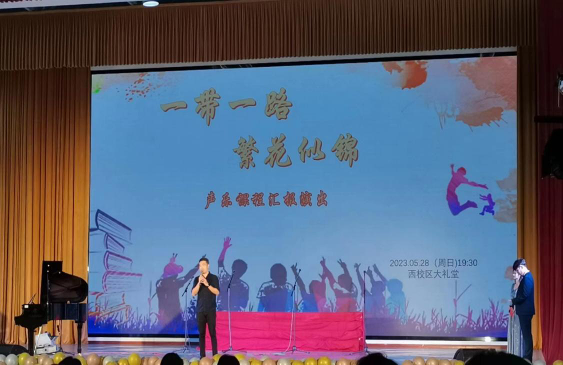 青春启航,奔赴星辰。2023年5月28日,学院艺术教育专业声乐课程汇报演出在西校区大礼堂成功举办。学校党委委员刘承初、学院副院长李水亮、李谦。艺术教育、学前教育专业师生应邀出席。本次汇报演出由学院艺术教育教研室承办,艺术教育专业2020、2021级音乐班全体学生参演。整场演出凸显“一带一路,繁花似锦”主题,以学生为主、老师为辅,通过师生默契合作,歌声悠悠,青春浪漫,为现场来宾奉上一场精彩绝伦的艺术盛宴,共同留下了一个美妙难忘的声乐记忆。