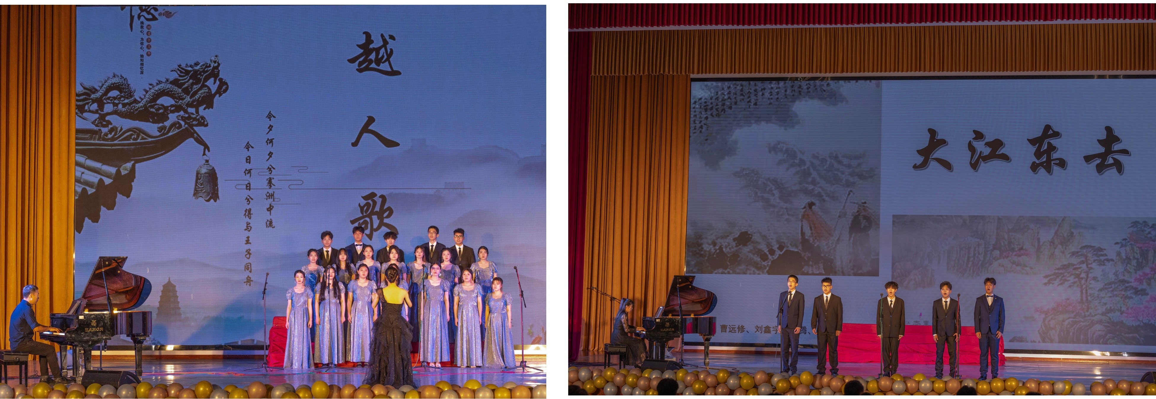 “山有木兮木有枝,心悦君兮君不知”,一首意境优美、荡人心绪的《越人歌》,拉开了此次演出的序幕。《大江东去》男生合唱,曲调淳朴、气息宽广,格调舒展、气韵潇洒。