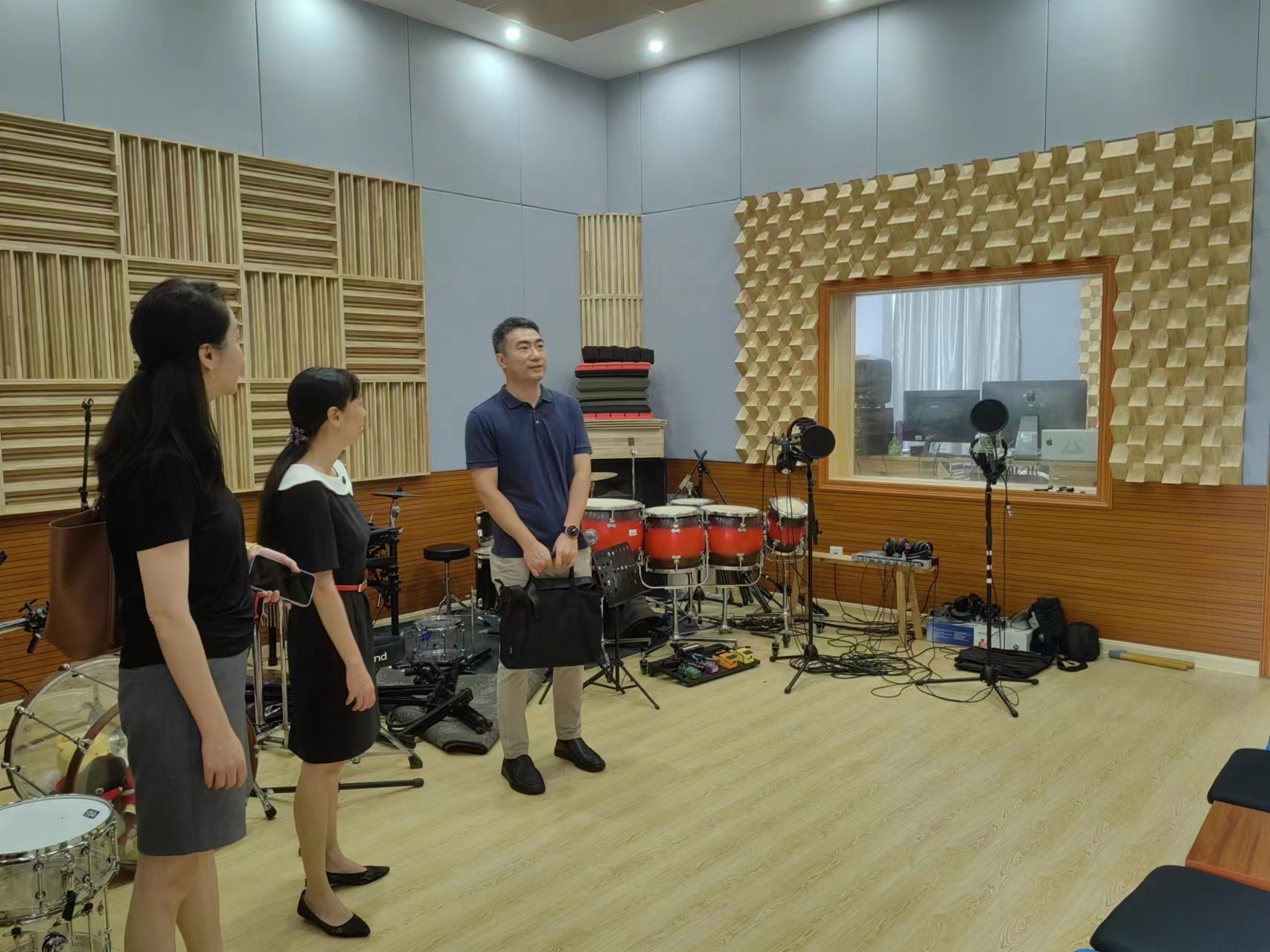 27日上午,在南宁师范大学音乐与舞蹈学院党委书记陈宇、院长黄妙秋的带领下,考察交流团一同参观了学院的音乐厅、报告厅、广西少数民族乐器研究中心展厅、琴房、录音棚、舞蹈教室等实训场地。在广西少数民族乐器研究中心展厅,黄妙秋院长亲自讲解了无孔笛、瑶笛、美骆琴、竹鼓等由音乐名师工作室传承、改良、创新的广西民族民间乐器,并邀请我院考察交流人员一同参与演奏体验。
