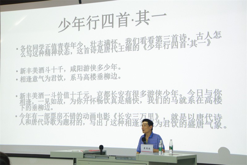 黄伟林教授表明绘画与文学有天生的亲缘关系,正如“诗中有画,画中有诗”,并在一定程度上几乎可以做到诗画合一。他介绍了著名画家、散文家丰子恺,并例举其以《夏日田园杂兴•其七》《思帝乡》《少年行四首•其一》等七首诗而创作的漫画作品,阐述了丰子恺先生漫画作品的人情味,说明了漫画通过有趣生动的绘画艺术和画面形式让诗词的意蕴精髓和浓厚情感得以更为具象地呈现。