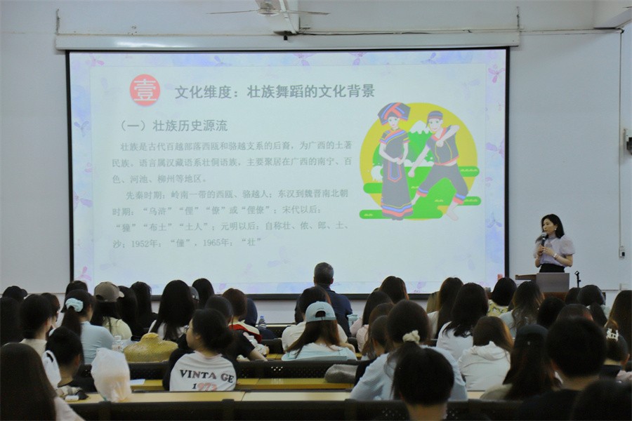5月21日下午,广西大学艺术学院副院长、舞蹈系主任,硕士研究生导师付宜玲教授莅临我校,在西校区伦理楼107教室为学校师生带来了一场题为《壮族舞蹈的多维阐释》的精彩讲座。讲座以壮族舞蹈为核心,通过多维度的学术视角,探讨其独特的文化符号、历史演变、艺术表现及当代传承。为现场师生带来一场精彩的文化学术盛宴。