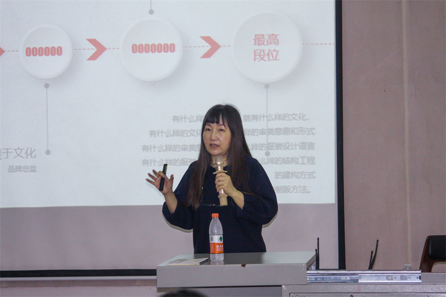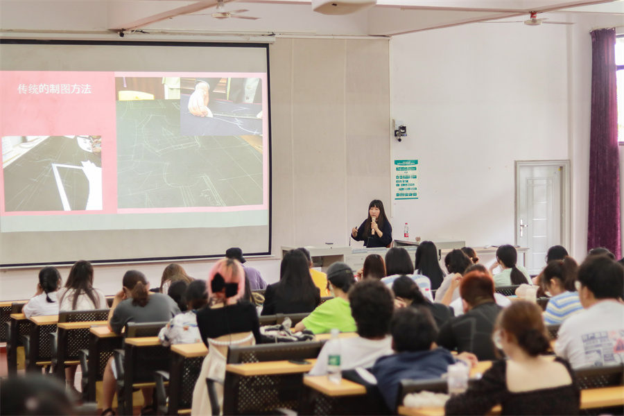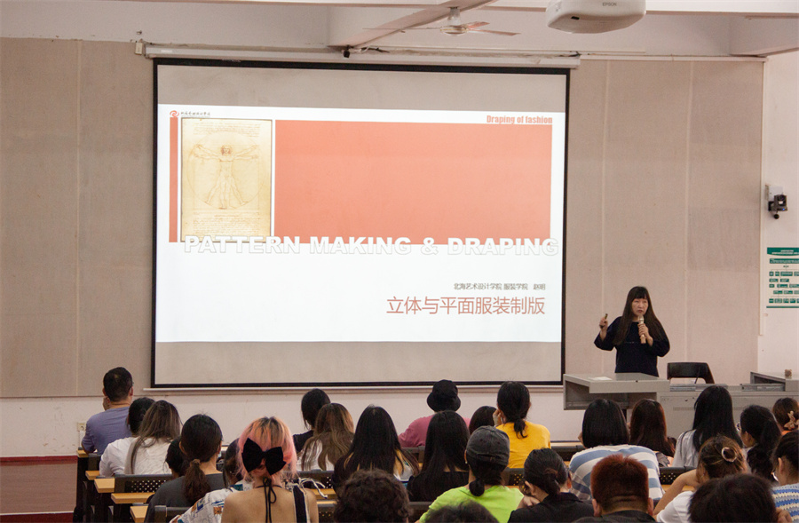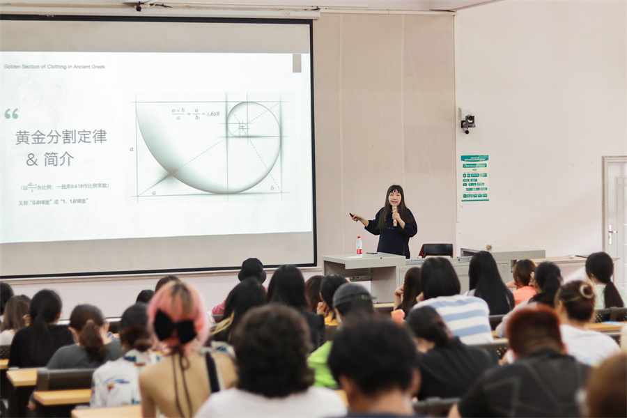 讲座一开始,赵明教授以服装结构切入课堂,概述了服装结构对后期服装工序的重要性。她表示,人是万物的尺度,服装结构以人体为依据,服装设计要能够体现出整体的协调。而黄金分割比例在服饰造型设计、构成的应用中发挥着重要作用,运用好这个比例可以更好的体现出服装整体的舒适感和美感。赵明教授强调,作为服装设计师,要本着服装好做、好卖、好穿、好看、好打理五个原则对服装结构进行设计,希望同学们今后要认真学习服装知识,打好基础,以助于做出完美的服装结构设计。