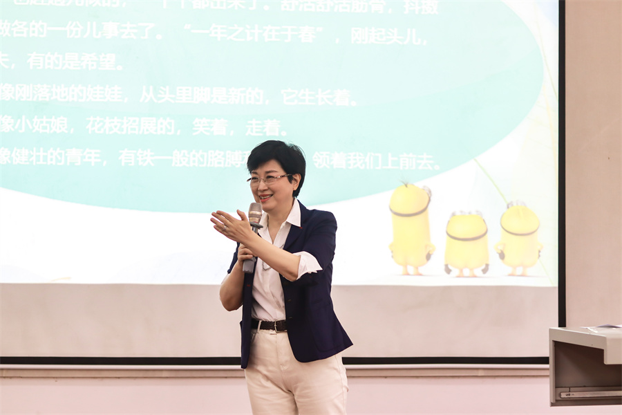 紧接着,周游教授以朱自清的《春》为例,给同学们播放了孙小梅和康辉朗诵的片段,并现场邀请六位同学上台朗诵并做出点评,她表示:“因为地域的不同,每位同学所感受到的春不一样,情也就不一样,我们的体会与动情是最重要的”。希望大家能热爱生活,从日常生活中能发现美,体会情。