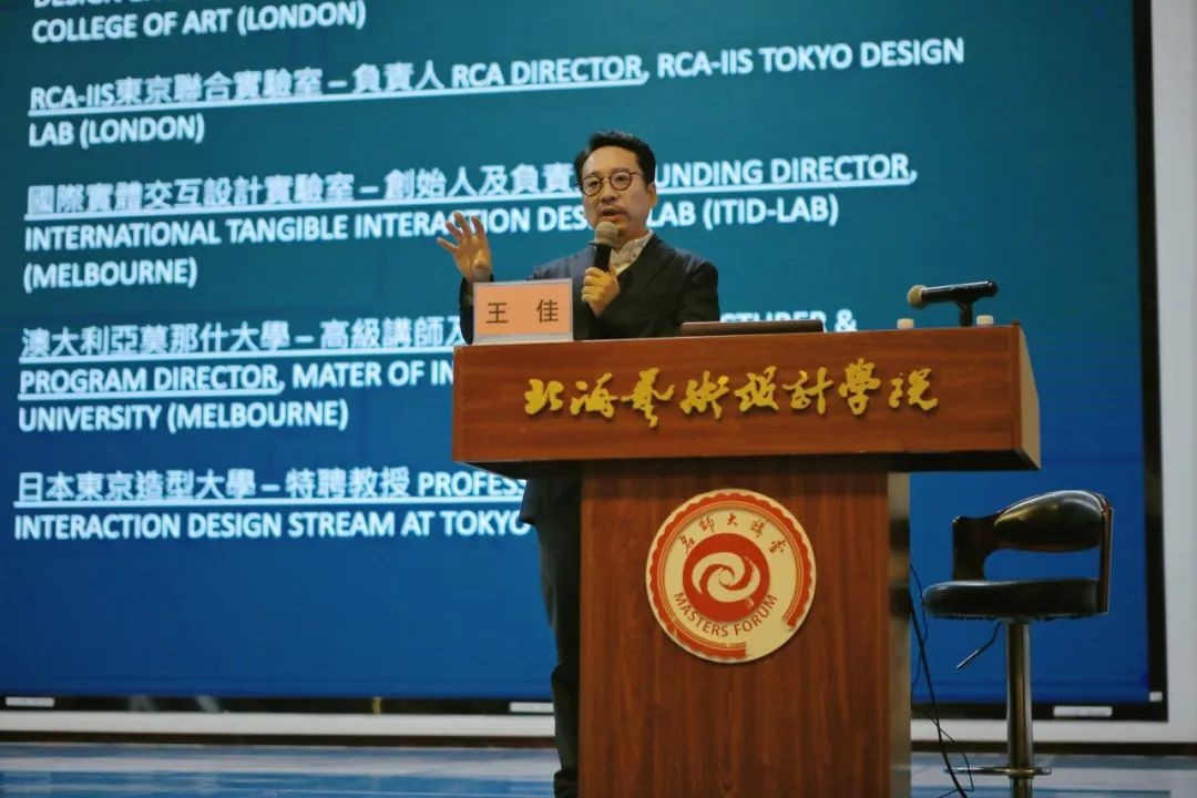 王佳教授指出,AI是当今更具革命性的一个技术,他引导现场师生思考AI在设计流程中需要扮演一个什么样的角色?带领大家逐步深刻体会智能设计的作用。AI的运用不仅显著提高了设计的质量和效率,更为设计创新注入了新的活力,智能技术的发展为设计带来了巨大便利。此外,王佳教授还表示要明确设计的目的,并指明了共生是一个更符合人与AI关系的概念,强调了人与AI技术共生的发展趋势。