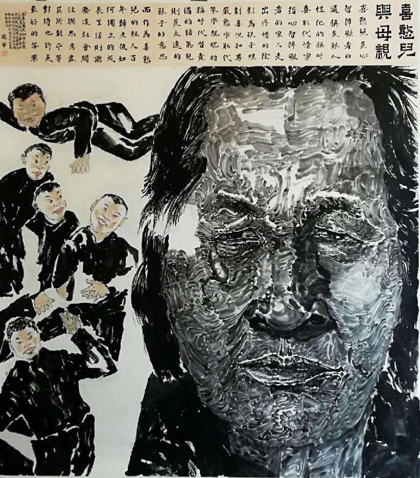 王苏华 《喜憨儿与母亲》2019年 纸本水墨 200cm × 240cm