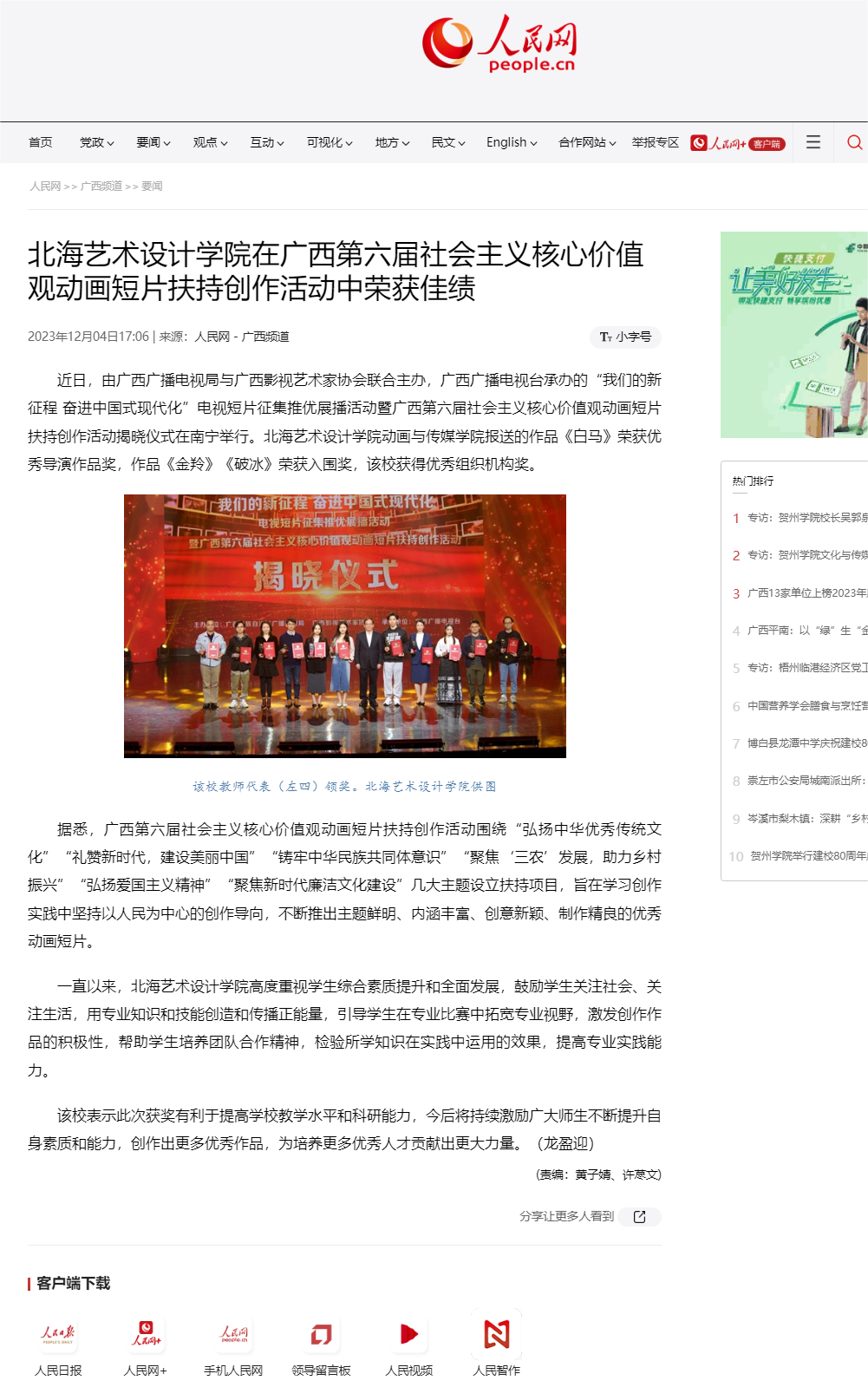人民网:北海艺术设计学院在广西第六届社会主义核心价值观动画短片扶持创作活动中荣获佳绩