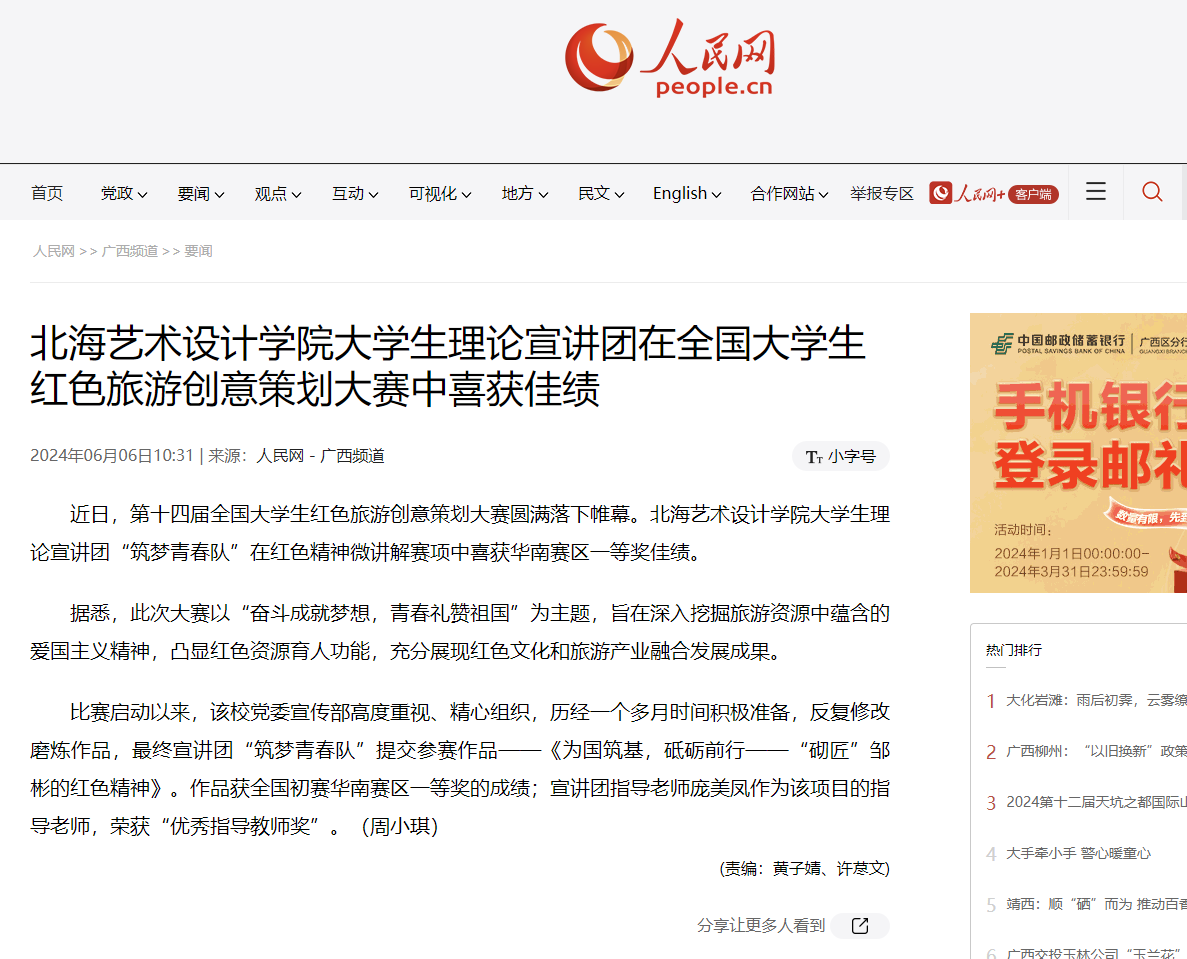 人民网:北海艺术设计学院大学生理论宣讲团在全国大学生红色旅游创意策划大赛中喜获佳绩