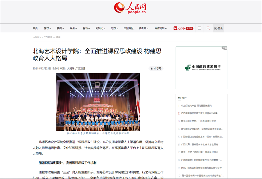 12月21日,人民网以《北海艺术设计学院:全面推进课程思政建设 构建思政育人大格局》为题,报道我校在全力推进课程思政建设,构建思政育人大格局方面的具体措施和显著成效。我校将持续拔高政治站位,以更强的思想和行动自觉推进课程思政全覆盖,逐步形成“院院有精品、门门有思政、课课有特色、人人重育人”的生动局面。