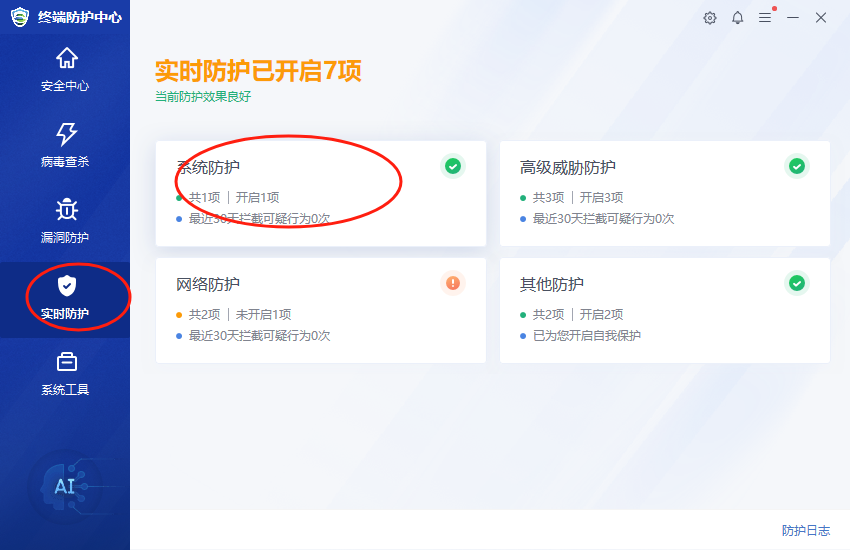1.点击电脑右下角的AES软件图标,打开AES软件,点击“实时防护”-“系统防护”