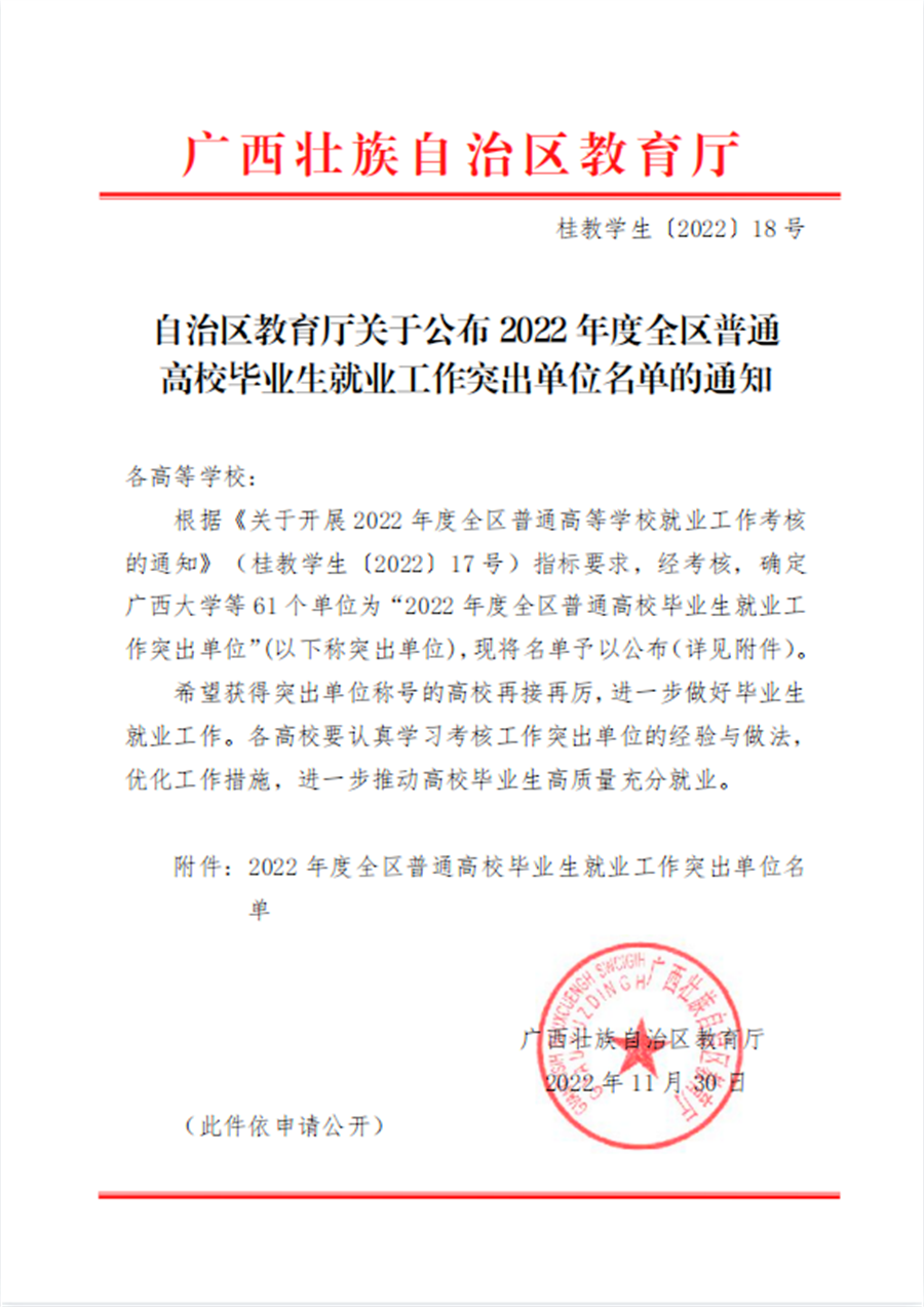 近日,自治区教育厅下发《关于公布2022年度全区普通高校毕业生就业工作突出单位名单的通知》,我校获得“2022年度全区普通高校毕业生就业工作突出单位”称号,这是我校第4年获得此项殊荣,体现了自治区教育厅对我校毕业生就业工作的充分肯定。