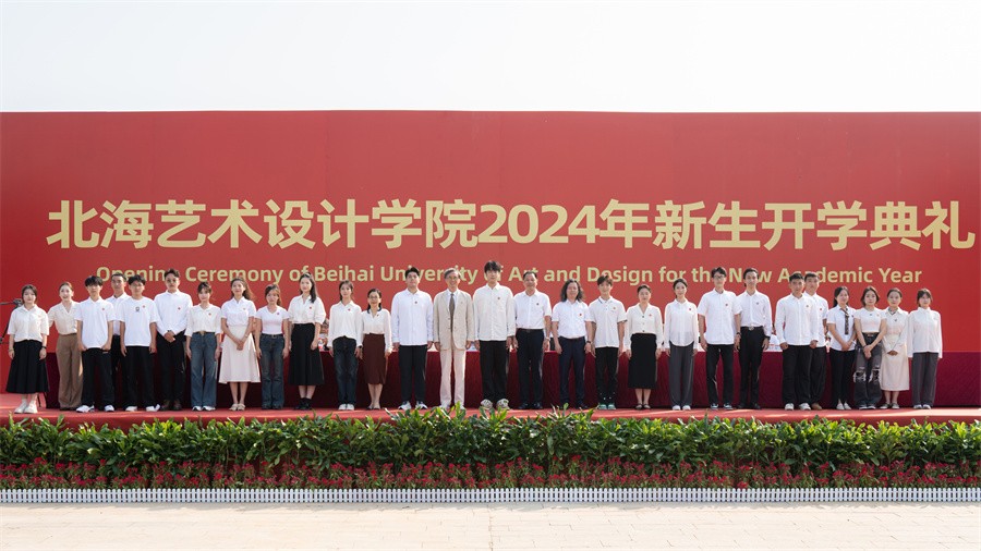10月11日,我校2024年新生开学典礼在园博园校区蓝天白云广场举行。北海市人民政府副秘书长、北海市人民政府办公室副主任蒲笛春;北海市教育局党组成员、副局长徐广辉;清华大学学术委员会副主任、博士生导师,原中国服装设计师协会主席,原清华大学美术学院党委书记、院长,北海艺术设计学院顾问委员会副主任李当岐;英国切斯特大学国际事务副校长兼艺术、人文与社会科学学院执行院长大卫·麦格拉维;日本武蔵野美术大学教授,日本著名生成AI人工智能设计师、舞台映像艺术设计师,中国中央电视台特邀艺术顾问大野一興;日本文化学园大学教授、日本色彩学会会员、北海艺术设计学院特聘教授田森恭子;日本著名平面设计师、创意总监兼艺术总监太田弘之;国家一级导演、著名编导、北海艺术设计学院舞蹈学院院长吴明奇;二级演员、北海艺术设计学院舞蹈学院副院长任家和;日中美术文化交流协会理事、北海艺术设计学院特聘教授尤海明;北海银滩开发投资股份有限公司总经理詹海松、副总经理关键;北海园博园资产管理有限公司副总经理苏小丹;学校党委书记覃宪儒,校长卢新华,常务副校长胡胜,党委副书记陈毅华、彭仁、刘承初,副校长邱杰、陶立阳、黄侃明、刘朝雄、包建明、何煜,总督学王斌,学校纪委书记王照伟等出席典礼,有关职能部门负责人、各二级学院负责人、教师代表和2024级3700多名新生参加典礼。典礼由学校党委书记覃宪儒主持。