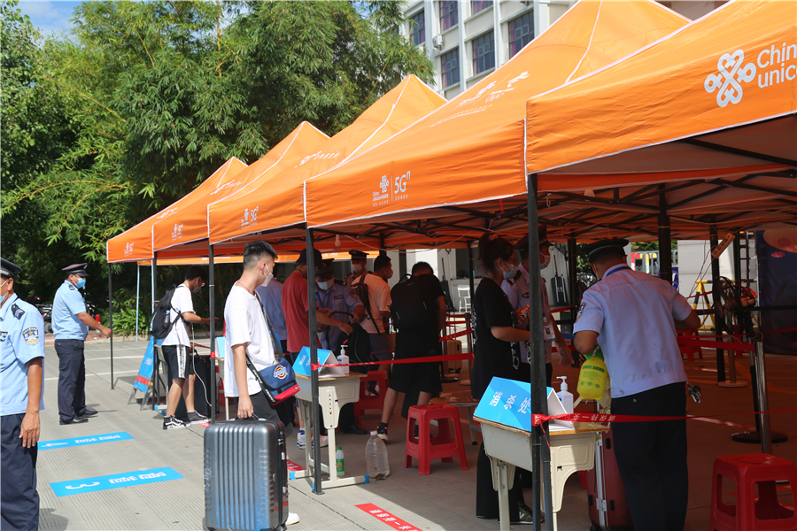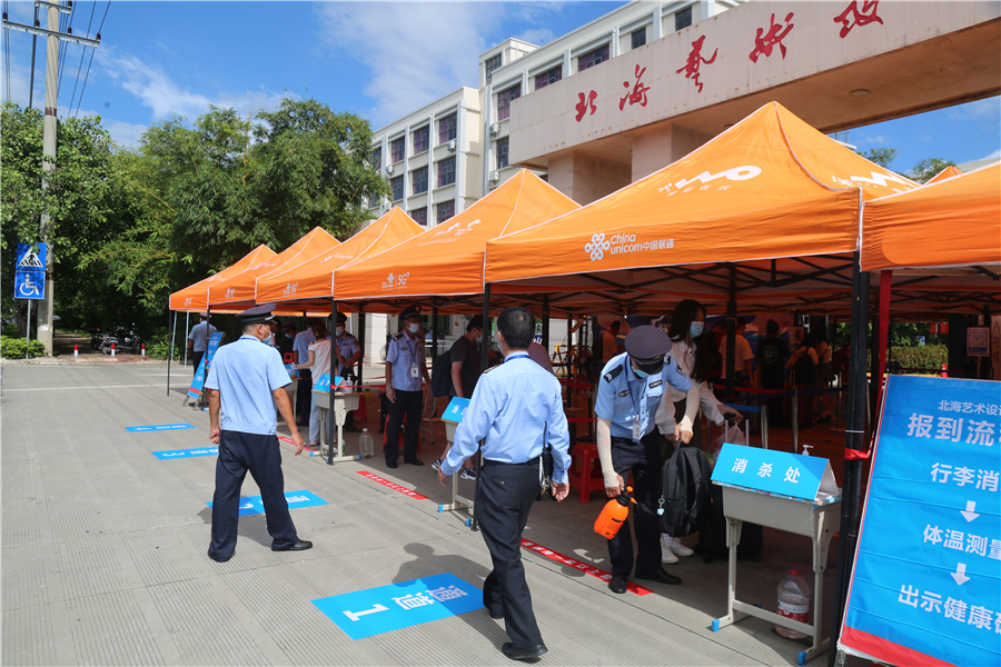 进校前,保安人员对返校学生行李进行严格的消毒并核验通信大数据行程卡、健康绿码无异常后,放行学生通过防疫测温通道进入接待区域。经接待点工作人员核对学生的个人身份信息、核验返校学生始发地出发前48小时内的核酸检测阴性报告以及学生返校前的14天自我健康状况监测表《北海市学校师生员工健康报告表》后,学生顺利返回校园。整个流程井然有序,方便快捷。