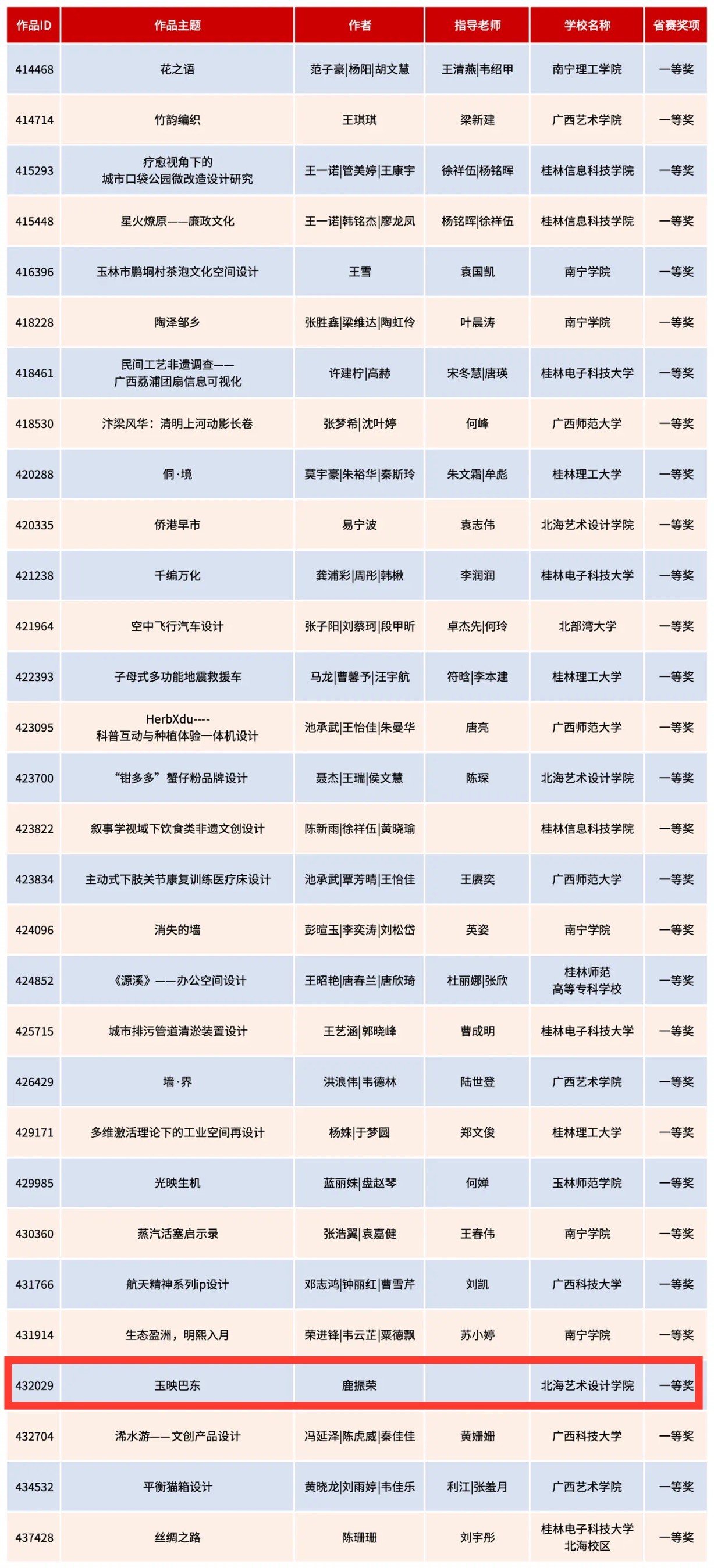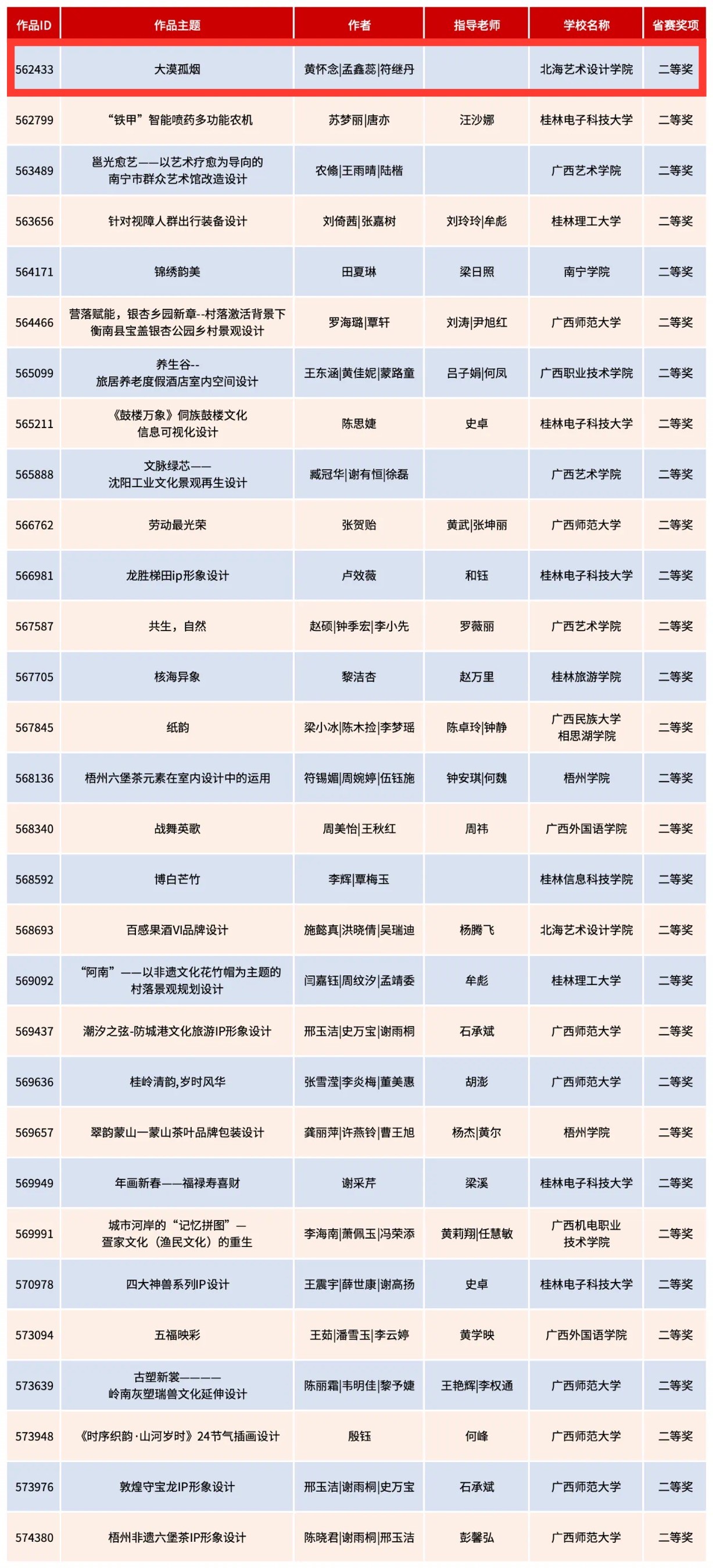 获奖名单按照作品ID大小排列