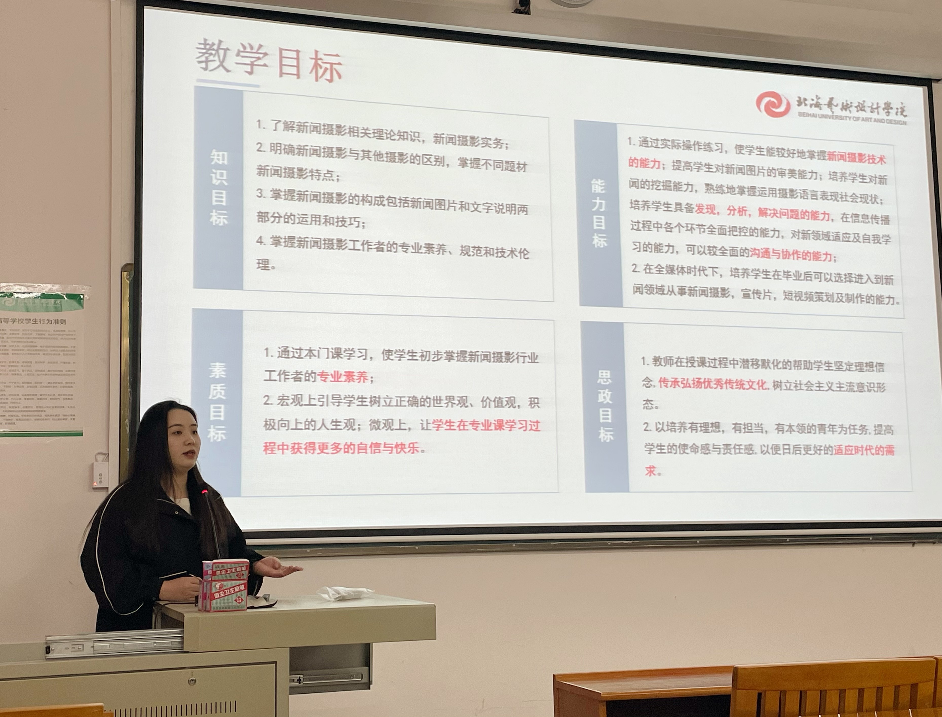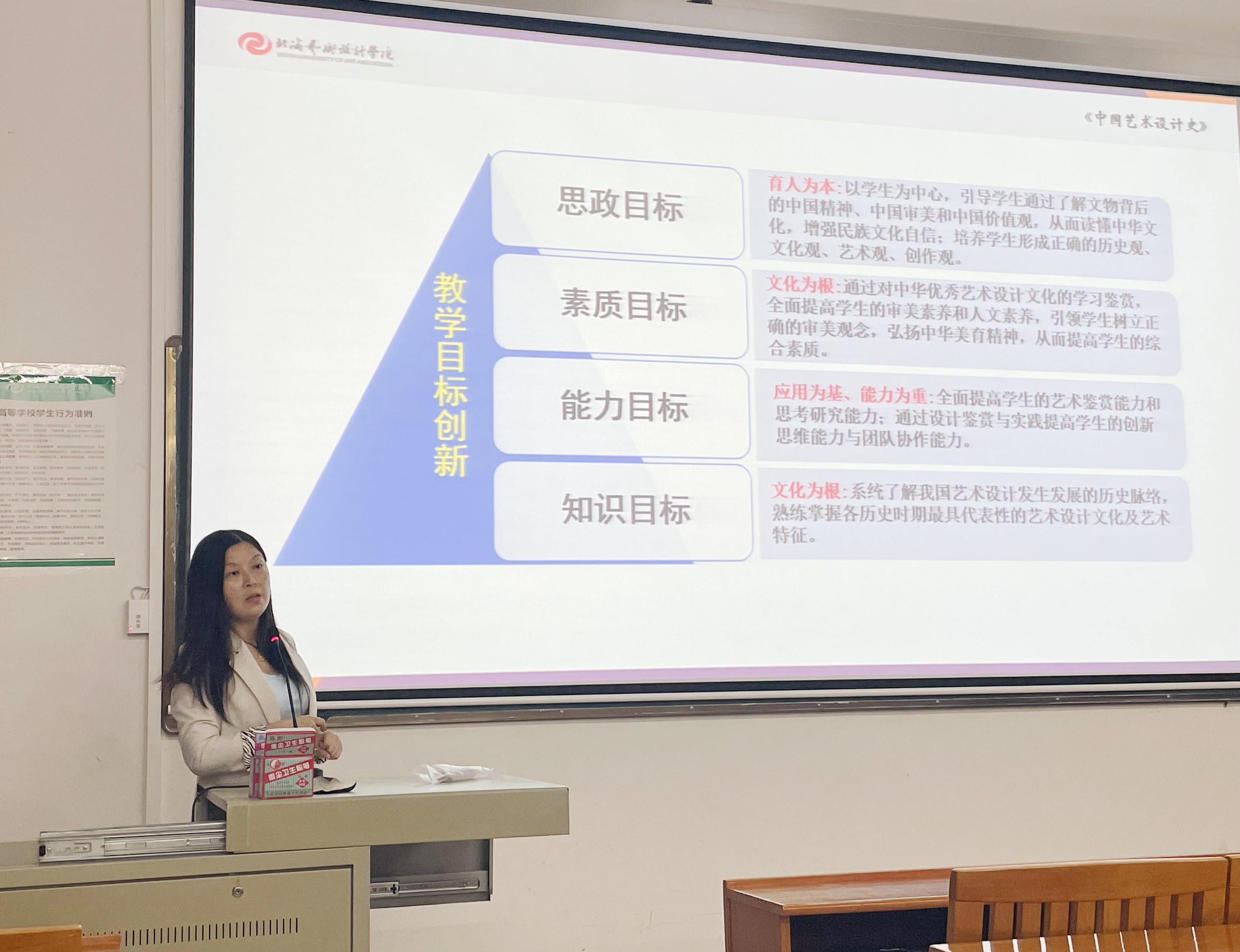 为引导学校教师潜心教书育人,推进课堂教学改革,推动信息技术与教育教学融合创新发展,促进产学研合作,提升我校教师教育教学水平和人才培养能力,11月8日,北海艺术设计学院2022年教师教学创新大赛校级决赛在我校西校区公德楼113顺利举办。大赛特邀郭庆教授、学校副校长彭仁、教务处处长武鹏程担任专家评委。决赛由教务处副处长林瑜主持,参赛选手及各学院代表观摩了此次比赛。