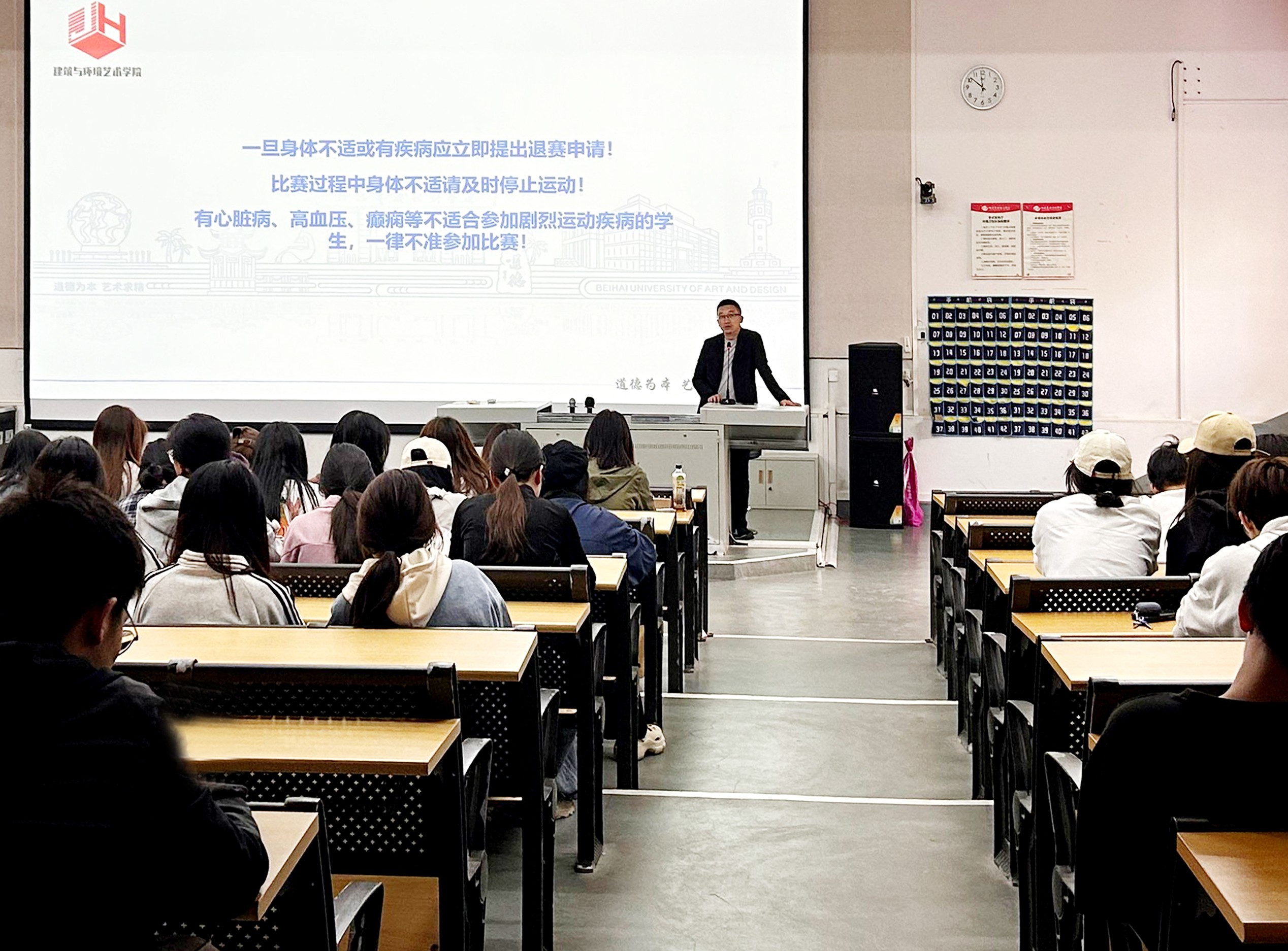 根据学校第十六届运动会工作要求,为确保运动会顺利进行,保障参赛学生安全,建筑与环境艺术学院于2024年11月20日,在公德楼107教室召开了运动员安全动员大会。会议由建筑与环境艺术学院学工办主任郭溪老师主讲,建筑与环境艺术学院全体参赛运动员参会。