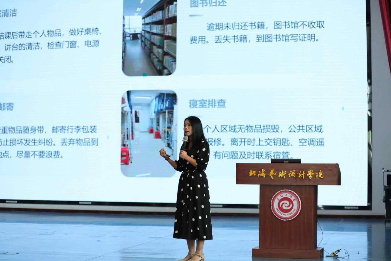 在校园生活方面,建筑与环境艺术学院总支副书记曲玥讲解离校前后、进京前后的注意事项。她建议同学们有序整理个人物品的同时,要确保教室、寝室等校园公共区域的环境卫生。提醒同学们在返乡及进京的途中,注意交通、人身、财产安全。进京后要遵纪守法,自觉遵守北京市和所在基地的其他相关规定,展现“北艺人”的素质。