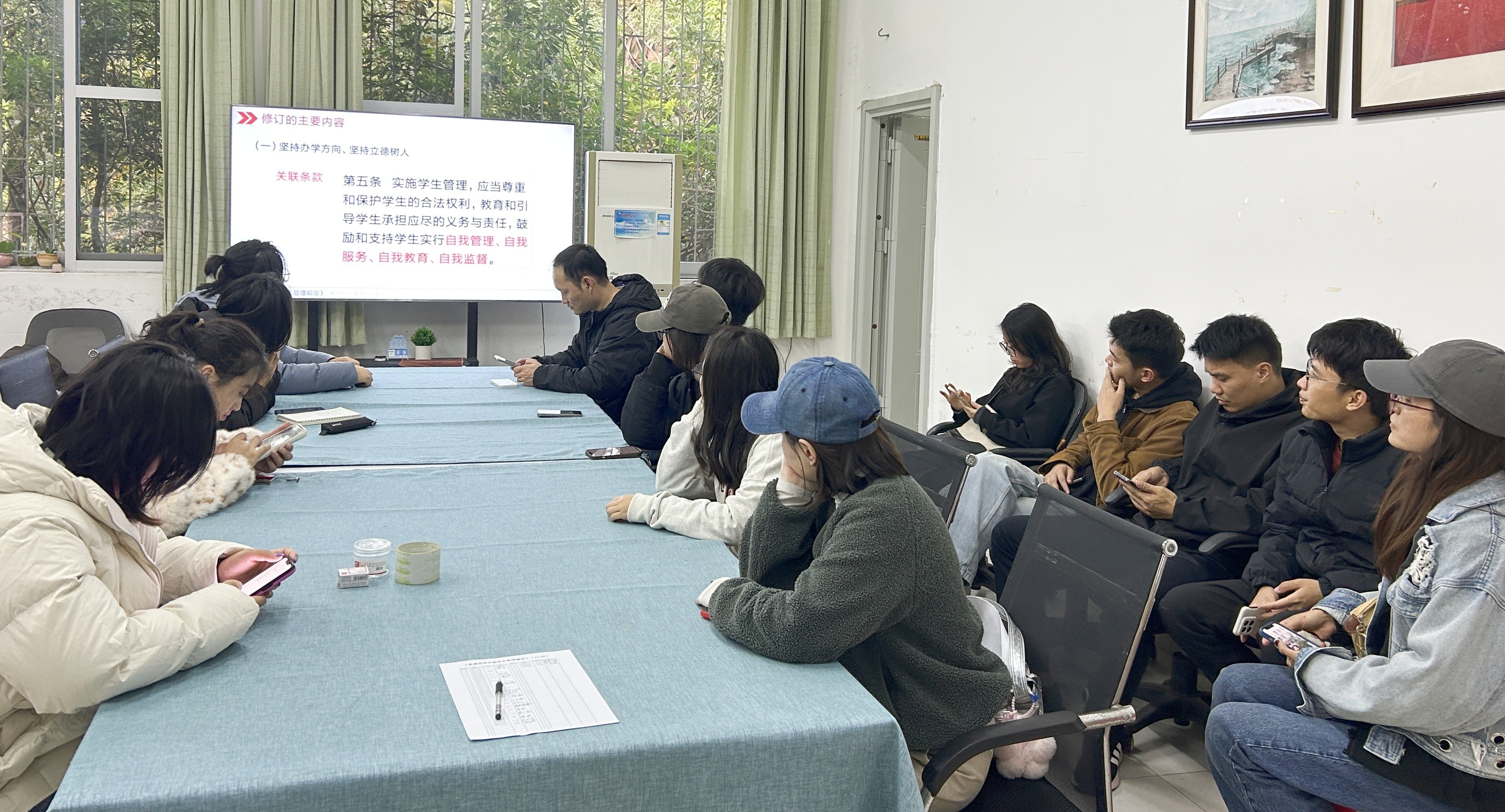 此次学习内容涵盖学生权利与义务、学籍管理、考核成绩记载、转专业转学、休学复学、退学及奖励处分等多个关键方面,包括对该规定的详细释义及深入解读,旨在确保全体辅导员精准把握文件精神实质,为学校学生管理工作筑牢基础。