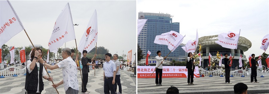 清华大学教授、北海籍著名雕塑家魏小明,北海旅游集团有限公司总经理舒英杰,学校总督学王斌为沙雕代表队授旗