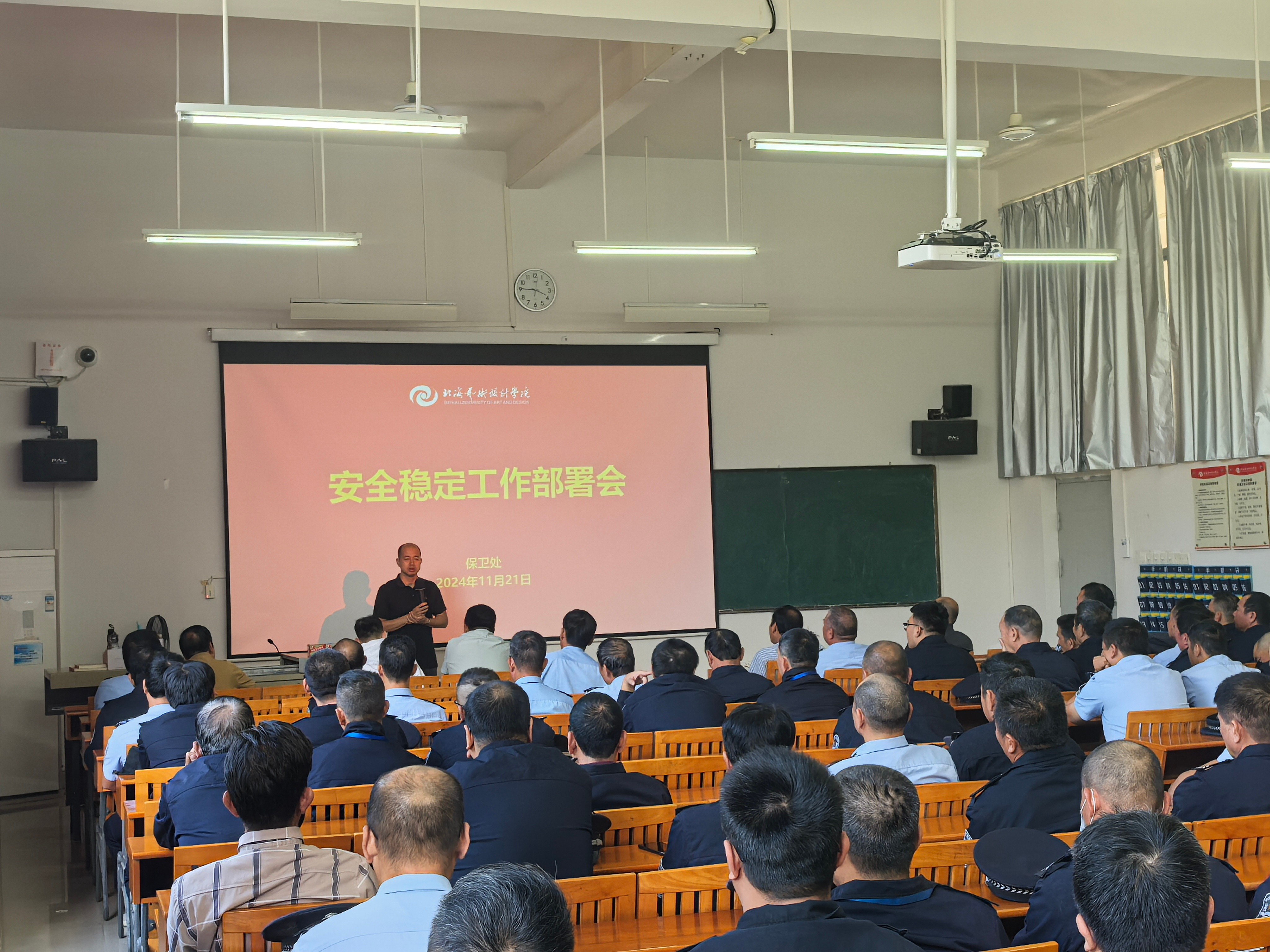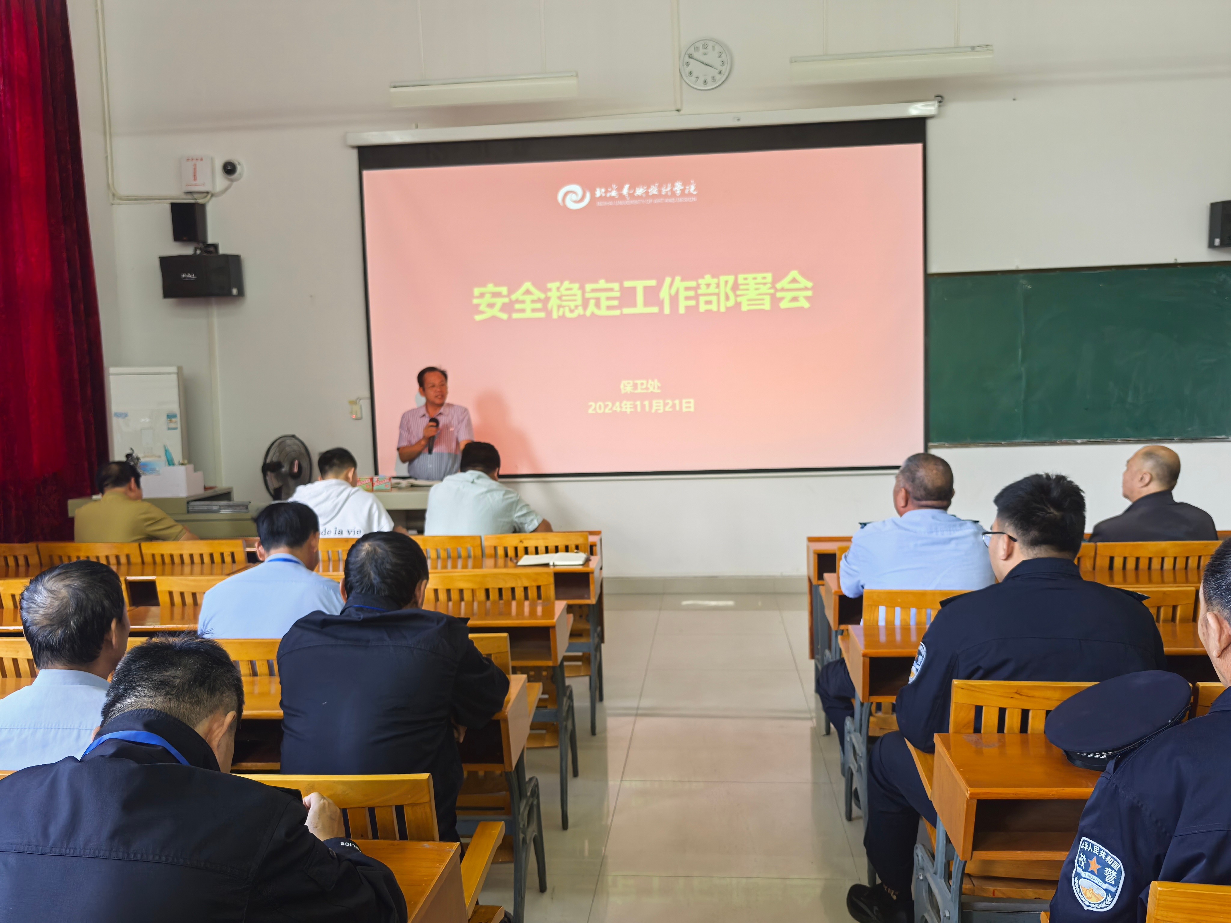 会上传达了关于切实做好近期校园安全稳定工作要求,通报了近期各地高校与社会突发案事件,要求全体安保人员按照学校要求及时开展内部风险点巡查,做到责任到位、分析到位、排查到位、整改到位,切实守住学校安全稳定工作的底线。