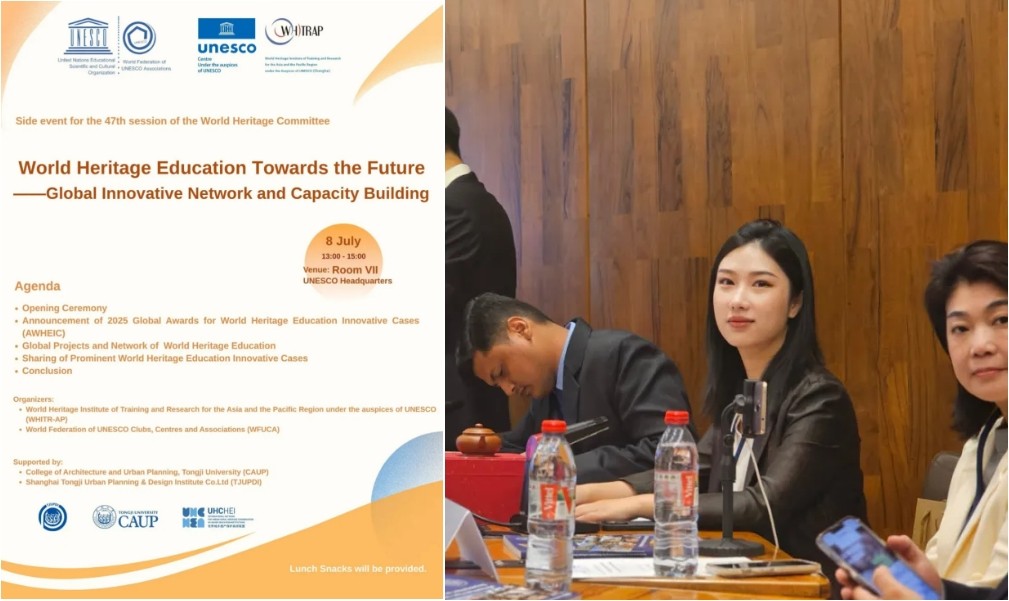 2025 年 7 月 8 日,正值《联合国宪章》发表 80 周年,第 47 届世界遗产大会主题边会在巴黎联合国教科文组织总部举行。此次会议以 “面向未来的世界遗产教育” 为主题,由联合国教科文组织亚太地区世界遗产培训与研究中心(WHITR-AP)和联合国教科文组织协会世界联合会(WFUCA)联合主办,同济大学建筑与城市规划学院提供学术支持,全球逾百位文化遗产领域专家齐聚,共探通过创新合作网络推动遗产保护的未来路径。​