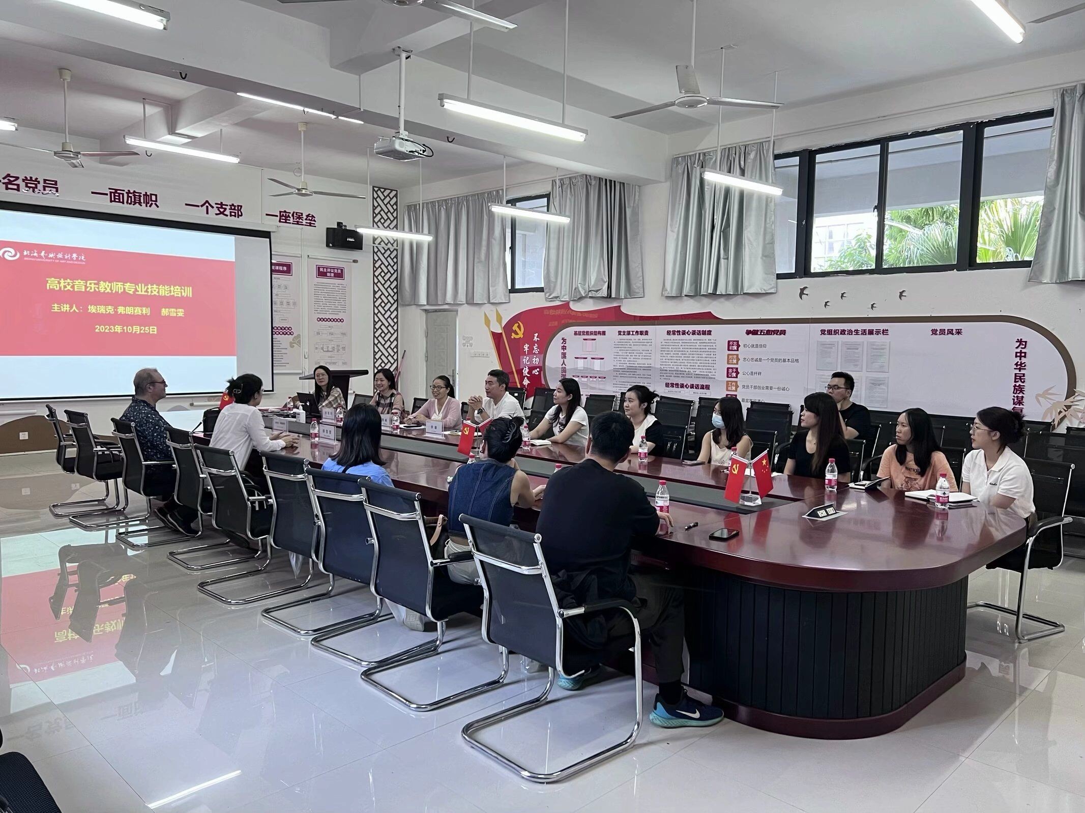为加强师资队伍的建设,提升青年教师专业技能水平,人文教育学院对青年教师开展专项培训。10月25日下午,人文教育学院高校音乐教师专业技能培训启动仪式在西校区公德楼204会议室举行,人文教育学院客座教授旅法长笛演奏家郝雪雯女士、古典吉他演奏家埃瑞克·弗朗塞利(Eric Franceries)先生、人文教育学院院长熊秀峰、副院长李谦及全体音乐教师出席启动仪式。仪式由艺术教育教研室主任孙嘉昕主持。