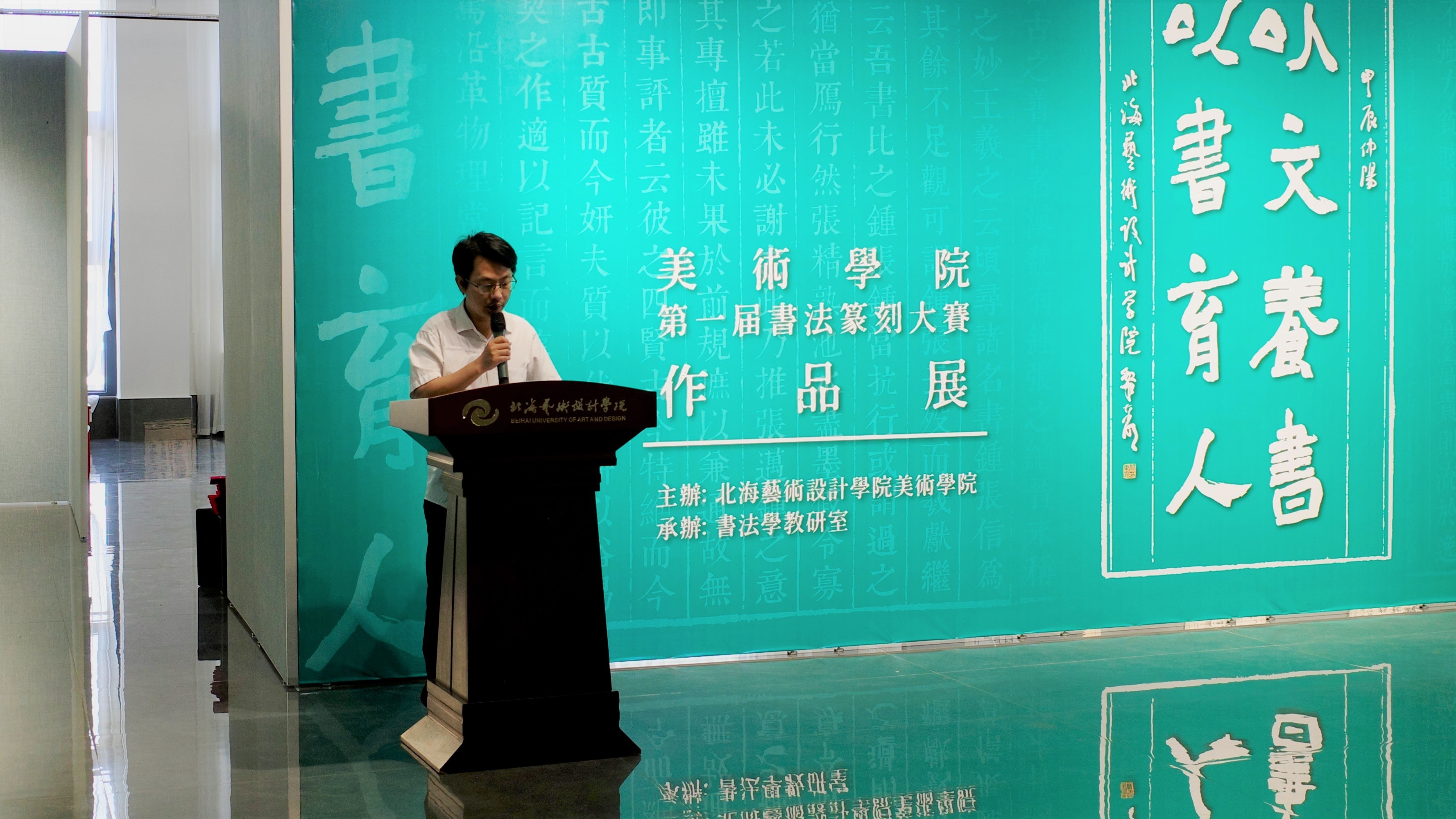 苏乃从主任在开幕中对本次展览情况进行简要介绍,其中提及本次展览收集作品数量以见同学们对比赛的重视。在对以中国传统文学经典为书写内容对“以文化人、以书载道”的传承,“学创融合,课展一体”教学模式的开展等方面进行阐述,并对在展览期间给予大力支持的学院领导、老师、同学们表示感谢。