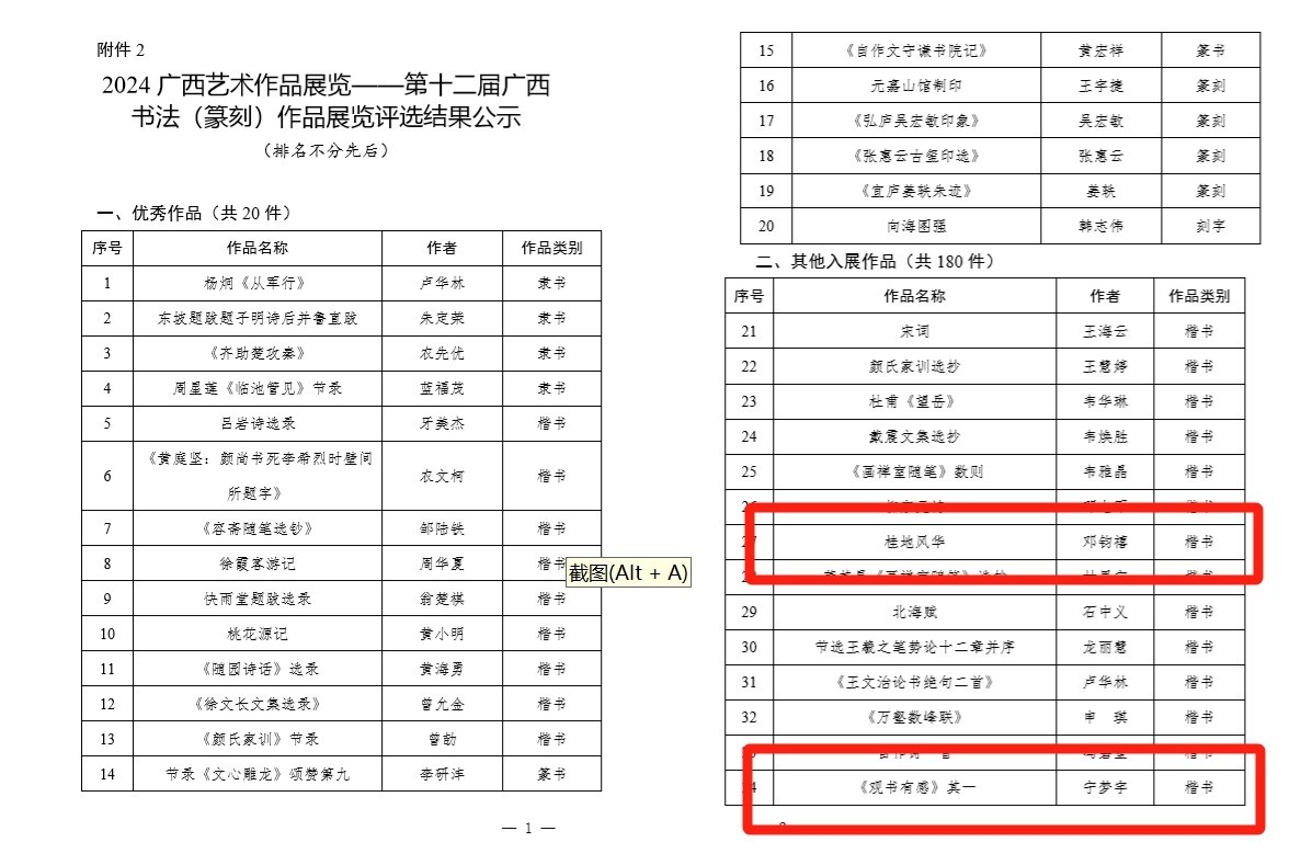 在2024广西艺术作品展览——第十二届广西书法(篆刻)作品展览中,书法学院教师宁梦宇、李鑫、熊东,2022级学生邓钧禧作品入展。