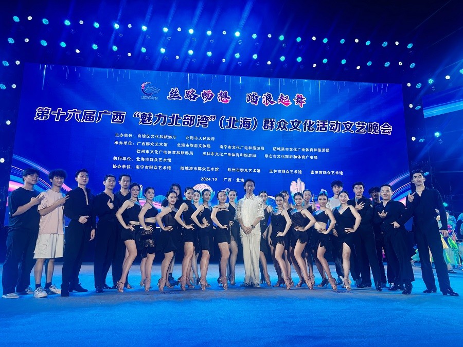10月19日,广西壮族自治区文化和旅游厅、北海市人民政府主办 “丝路畅想 踏浪起舞”第十六届广西“魅力北部湾”群众文化活动。作为本次活动的重头戏,“大舞台”文艺晚会在北海银滩“潮”雕广场举行。北海艺术设计学院舞蹈表演专业20余名大一师生受邀参加。