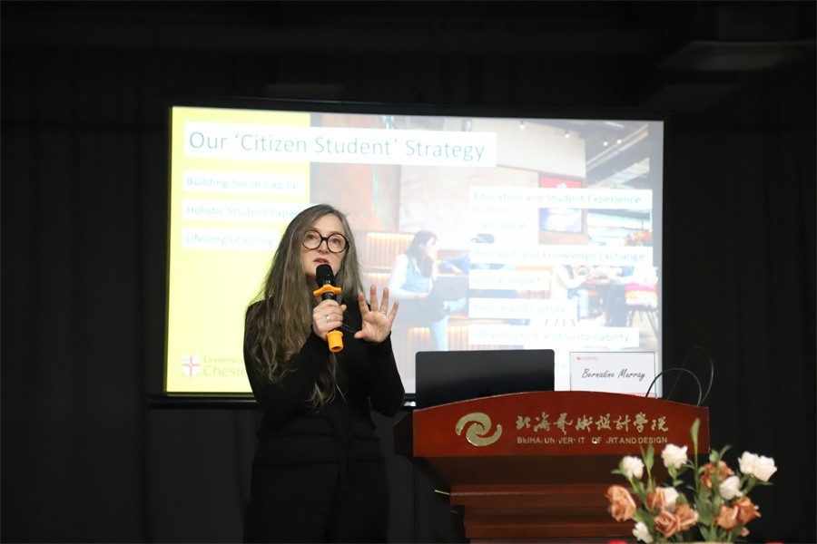 在《创意与设计——切斯特大学分享》的专题讲座中,伯纳丁·穆雷院长阐述了创意与设计在当代社会中的重要性。创意与设计已经渗透到商业、科技、教育等各个行业,成为了推动社会进步和经济发展的关键力量。伯纳丁·穆雷院长还通过丰富的案例分析和实际项目展示,向现场师生生动阐述了创意与设计如何在解决实际问题、满足市场需求的同时,创造出具有独特价值和文化内涵的作品。