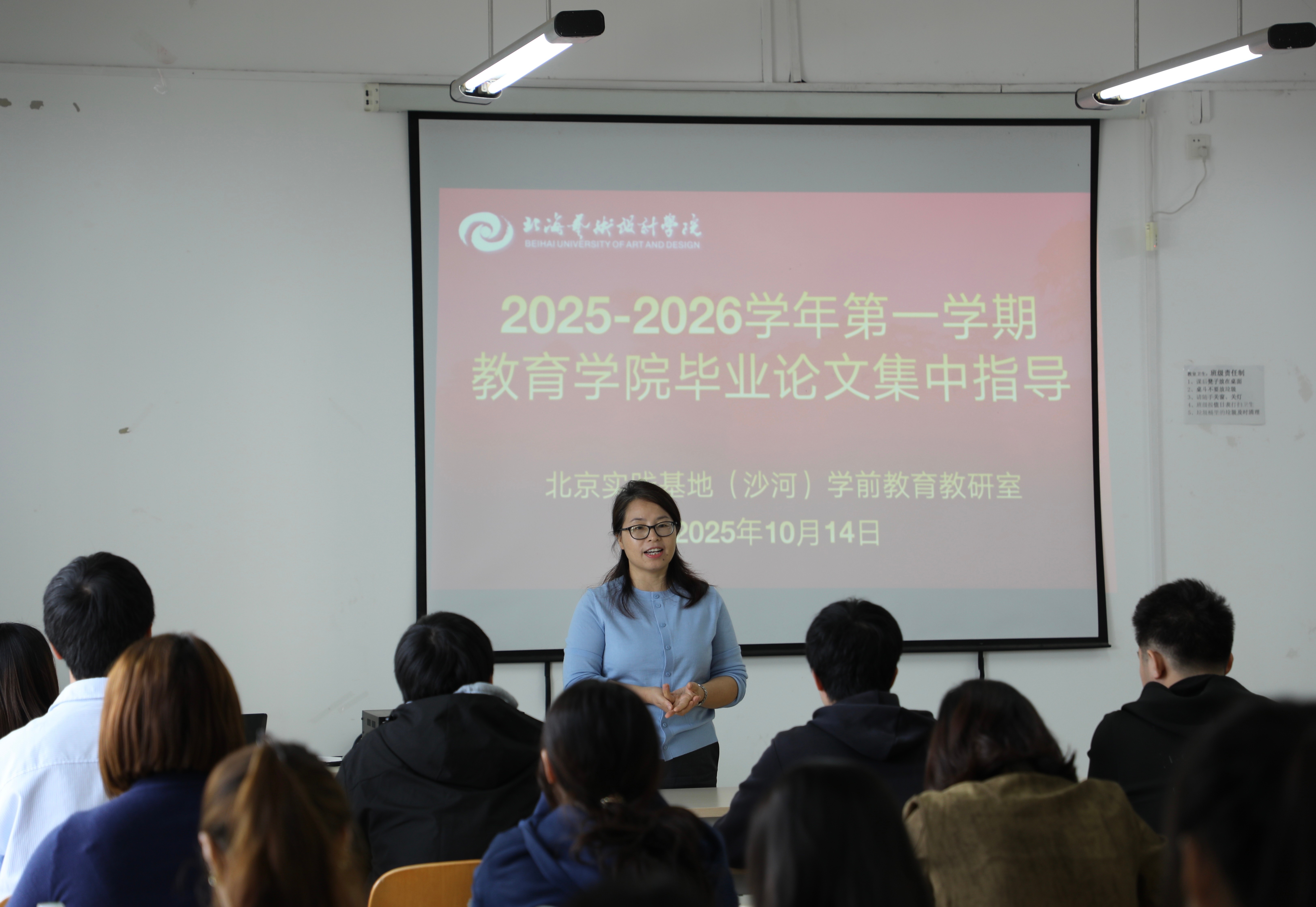 2025年10月14日至10月15日,教育学院2026届学前教育专业毕业论文开题答辩顺利举行。学前教育教研室主任覃思老师、教务办主任黄海林老师担任答辩评委,教育学院熊秀峰院长会后针对毕业论文环节集中指导。