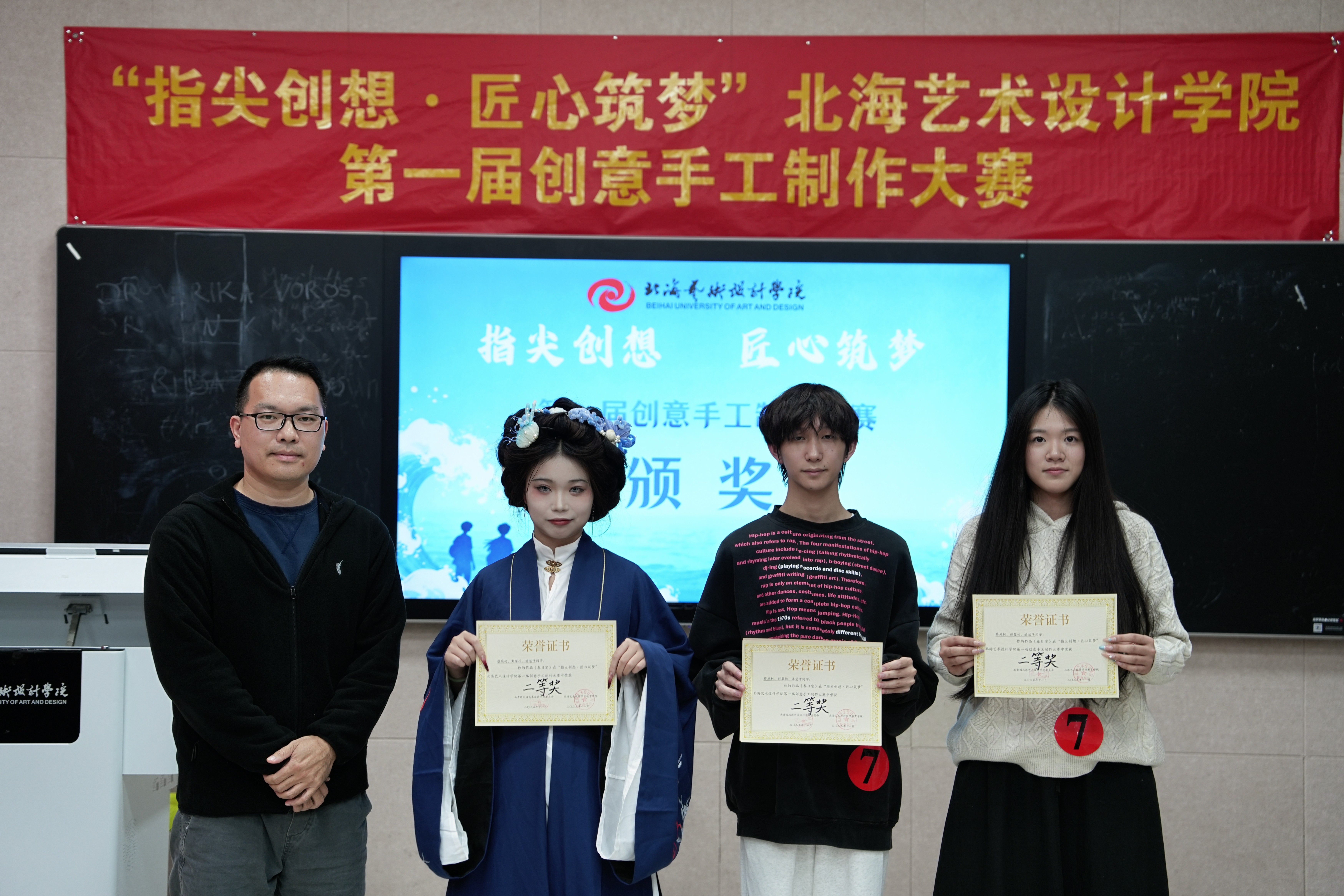 进一步提高我校学生实践创新能力,推动传统手工艺技艺与现代设计思维深度融合,搭建青年学子艺术才华展示与竞技平台11月21日共青团北海艺术设计学院委员会主办教育学院承办的指尖创想 匠心筑梦北海艺术设计学院第一届创意手工制作大赛决赛在西校区图书馆506智慧教室顺利举行。教育学院院长熊秀峰、副院长周劲志、书法学院副院长李家琪,以及各二级学院分团委书记出席决赛现场。美术学院创新创业工作负责人韩洋、教育学院张雨悦老师、马克思主义学院张鸿悦老师应邀担任决赛评委。