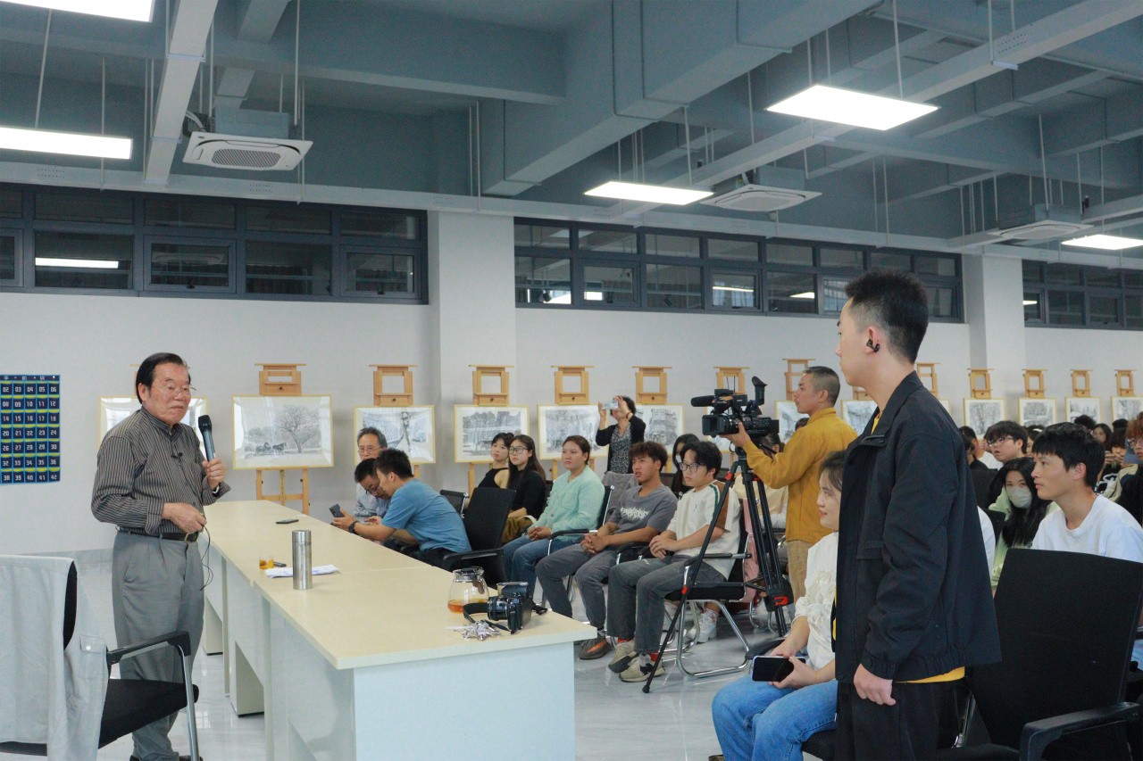 在提问答疑互动环节,林驹教授回答了有关于天赋的问题。他强调绘画学习中努力的重要性,绘画学习要勤劳,有激情,学会与生活相结合,用画笔随时记录生活中发现的有趣,同时保持耐心,稳住心态,静心学习。在绘画的取法与学习问题上,林驹教授讲解了大自然对绘画学习的重要性。他表示大自然就是最好的老师,同学们应当多亲近自然、靠近自然,不断拓展寻找绘画灵感的渠道。