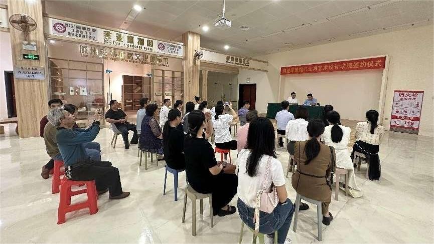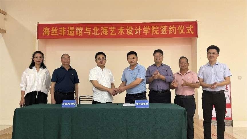 2024年3月26日,北海艺术设计学院美术学院龚为院长一行四人前往北海市非遗体验馆走访调研,与北海市工艺美术协会、非遗传承人们探讨地方非遗发展。在二十余位工艺美术大师和非遗传承人的见证下,我院与广西海路非遗文化传播有限公司圆满完成了校企合作签约仪式。